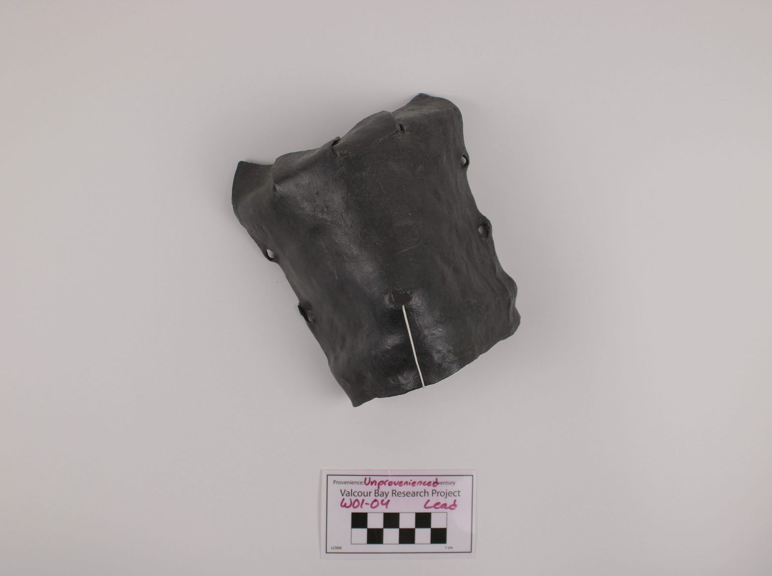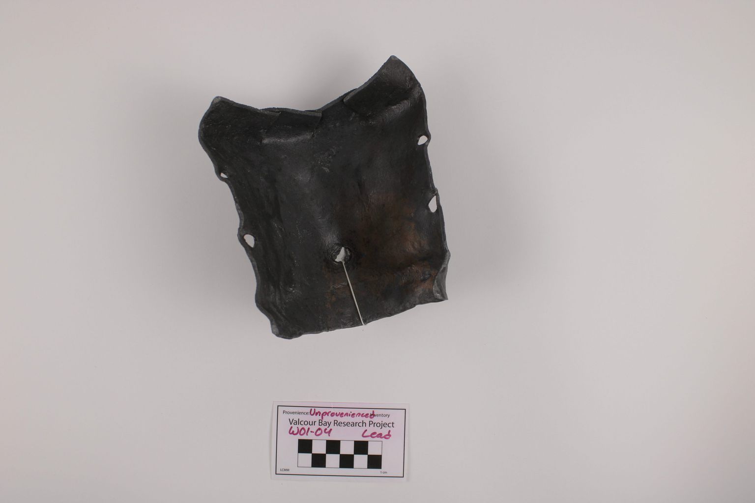 Artifact W01-04 is a lead cannon apron with a hole pierced in it. Given its size, it is likely an apron for a swivel gun.