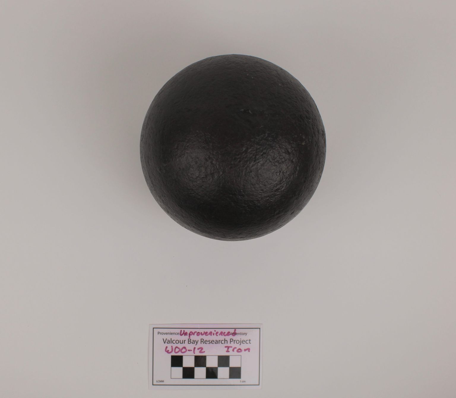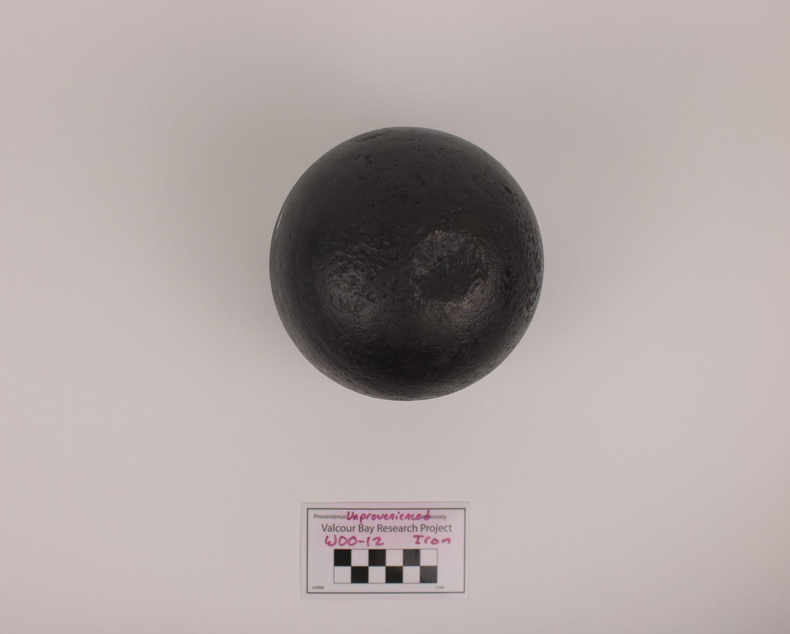 Artifact W00-12 is a cast iron solid round shot. According to the British Order of Battle for the gunboats, the Infernal was the only British gunboat armed with a 24-pounder positioned in the Left Division. This artifact has not been documented in detail.Collection