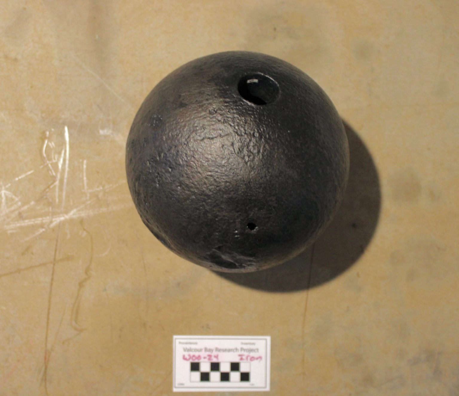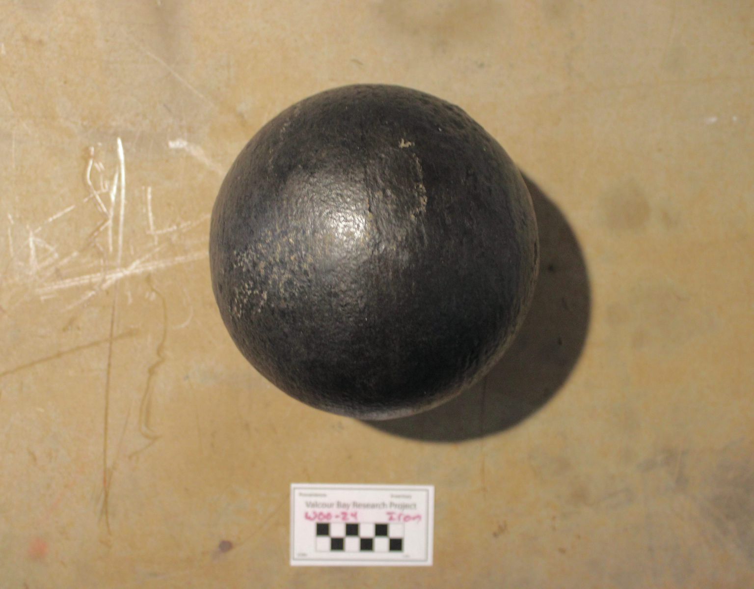 Artifact W00-24 is a cast-iron Coehorn Mortar shell weighing over 44 lbs.
