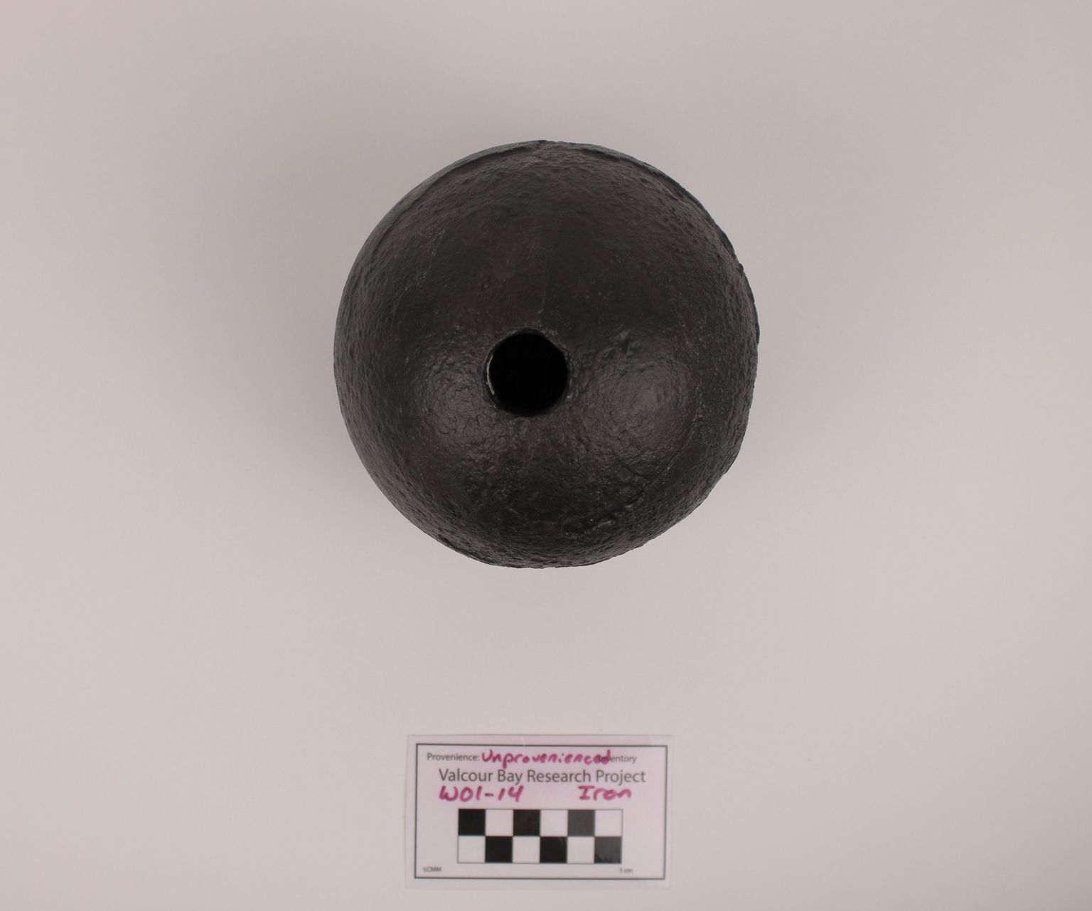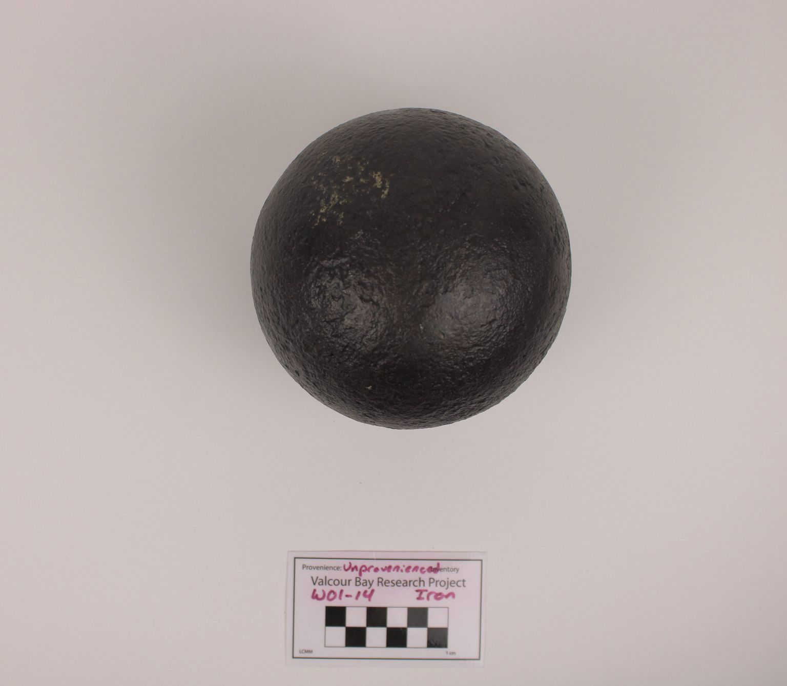 Artifact W01-14 was originally labeled as a 12 lb round shot in the VBRP report, but it is more likely a 5.5" Howitzer shell. It is associated with the fuse pieces W01-14.02 and W01-14.03.