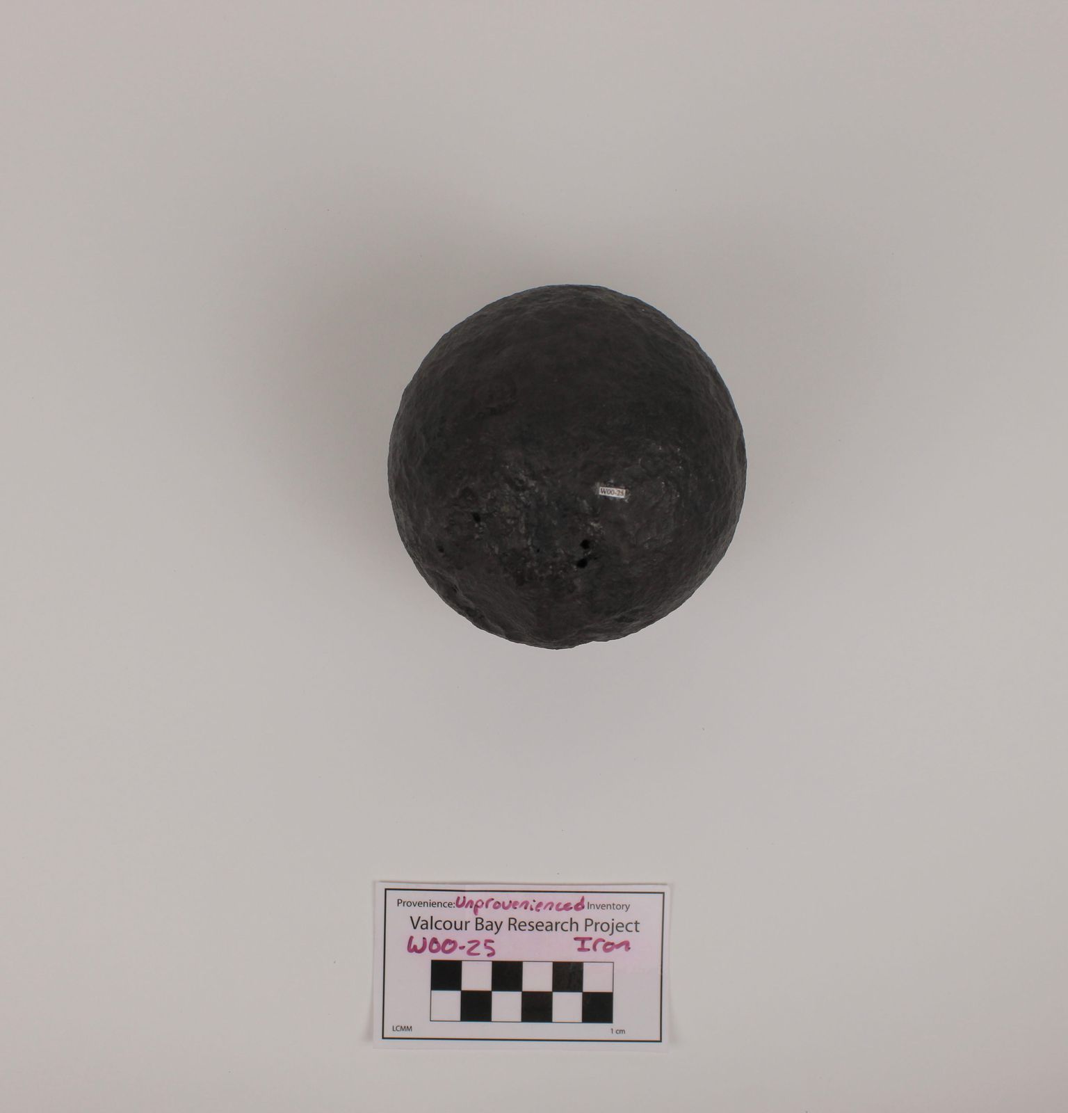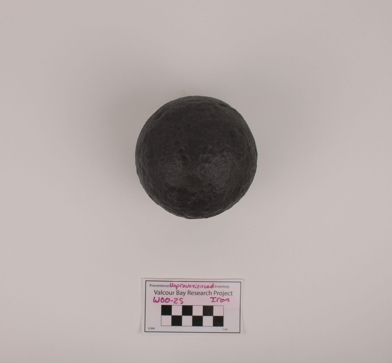 Artifact W00-25 is a 12 pound cast-iron round shot. Shot like these would have been fired from a 12-pound cannon, which were common among both the British and American fleets. This type of object, along with other shot of varying caliber, make up the most commonly recovered object from the site.Collection