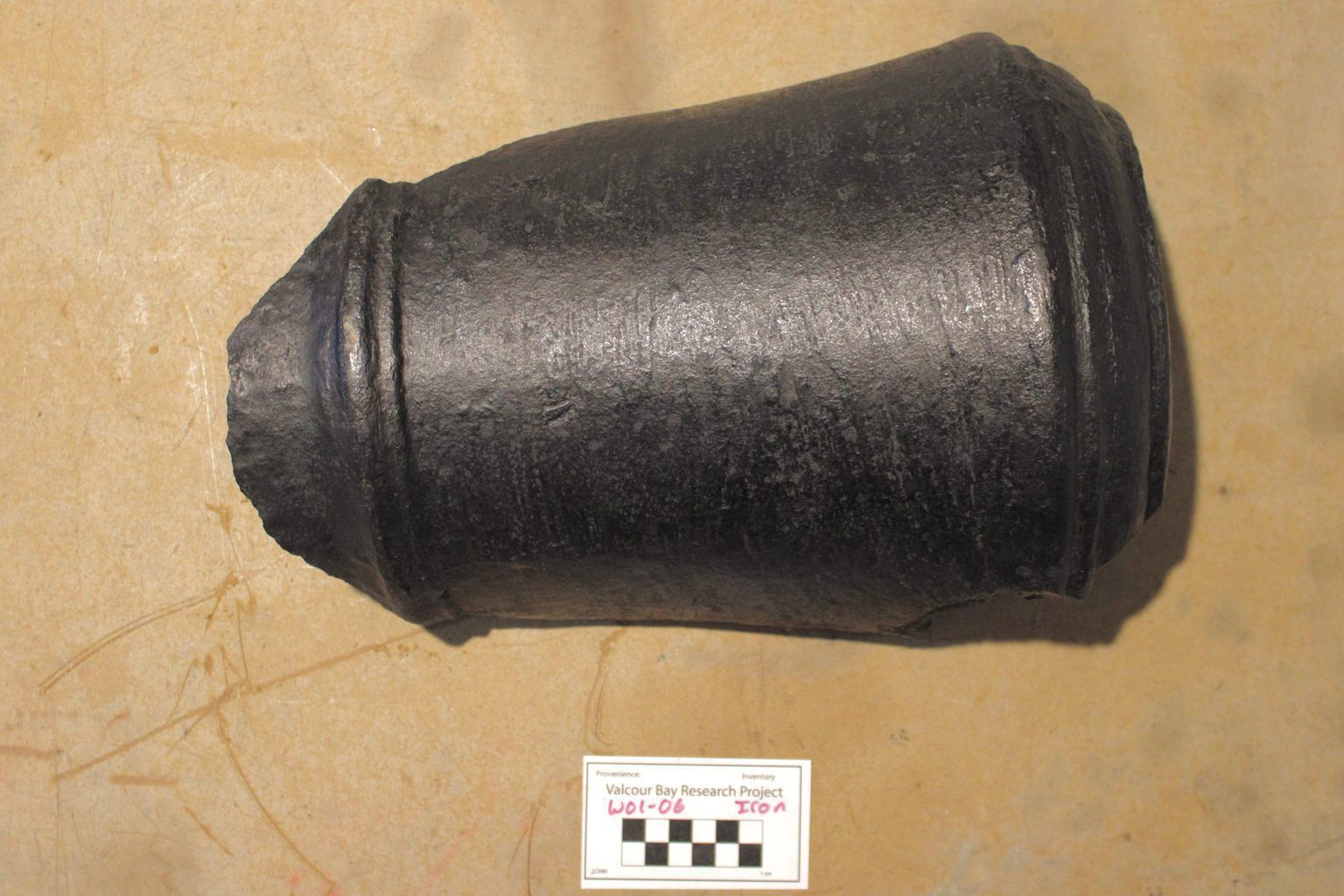 Artifact W01-06 is a cannon muzzle fragment. It appears that the muzzle was fractured during battle, either from a minor breach of the cannon during firing or a British cannon shot striking it. It is unknown which vessel this piece came from.Collection
