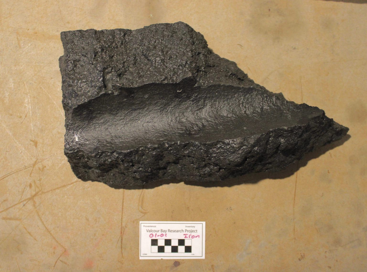 Artifact 01-03 is a cannon barrel fragment. This fragment contains portions of the first and second reinforce. It appears this fragment fits together with 01-04 which was found nearby.Collection
