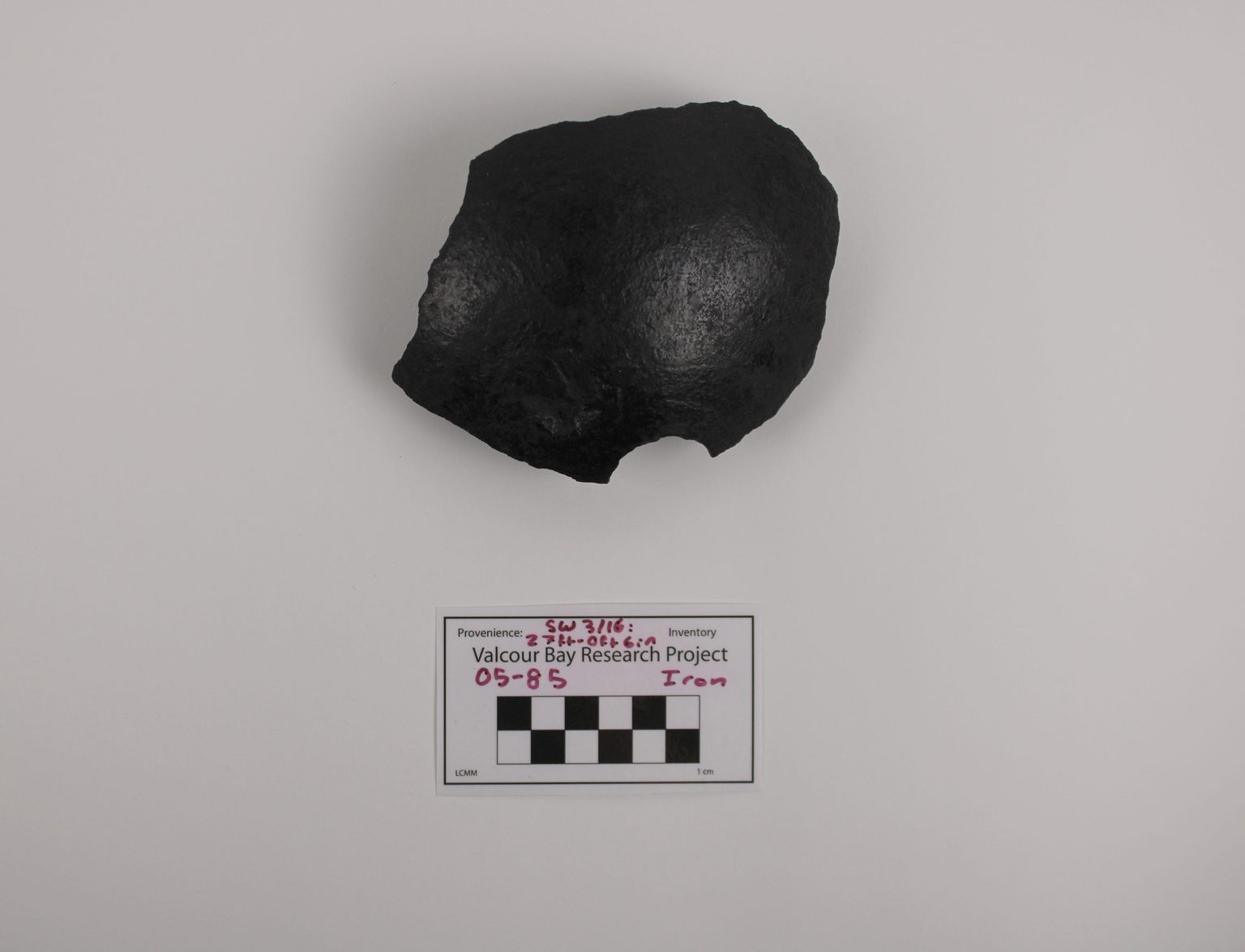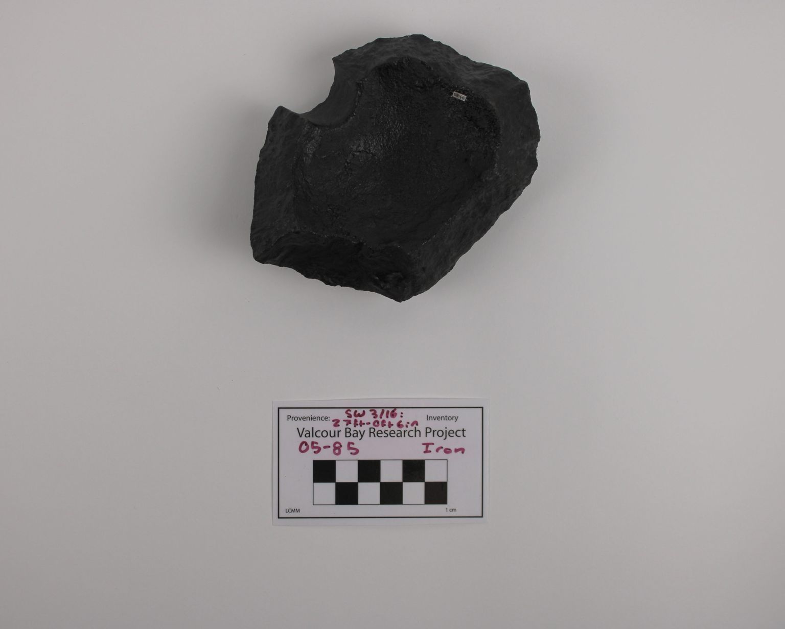 Artifact 05-85 is a fragment of a cast-iron Howitzer shell. It has an irregular shape with virtually no pitting with a minor impression mark.