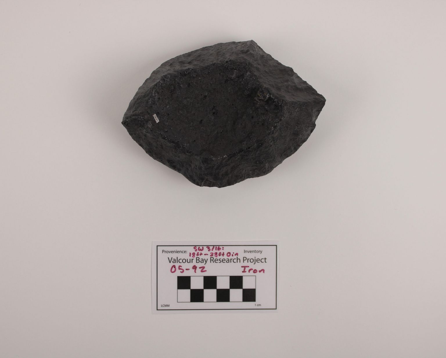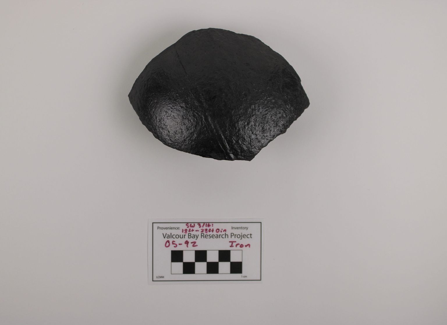 Artifact 05-92 is a fragment of a cast-iron Howitzer shell. It has an irregular shape with virtually no pitting on the outside. There is a single line casting mark circles the middle of the fragment. There is some interior pitting. This object fits with 05-96 as part of the same shell.