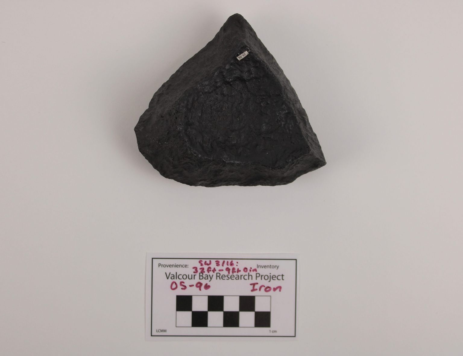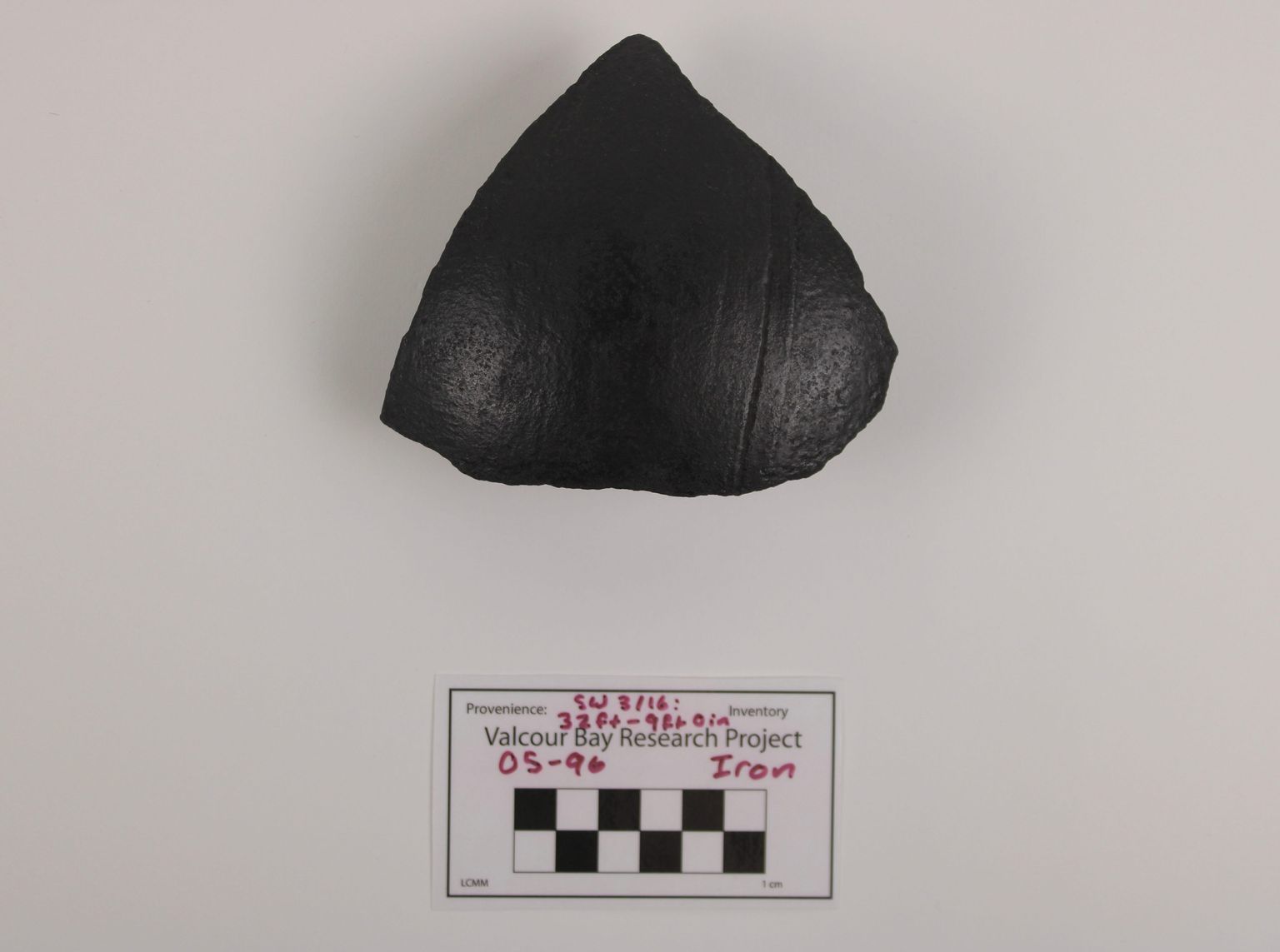 Artifact 05-96 is a fragment of a cast-iron Howitzer shell. It has an irregular shape. There is virtually no pitting on the outside. A single line casting mark circles the middle of the fragment. There is some interior pitting. This object fits with 05-92 as part of the same shell.