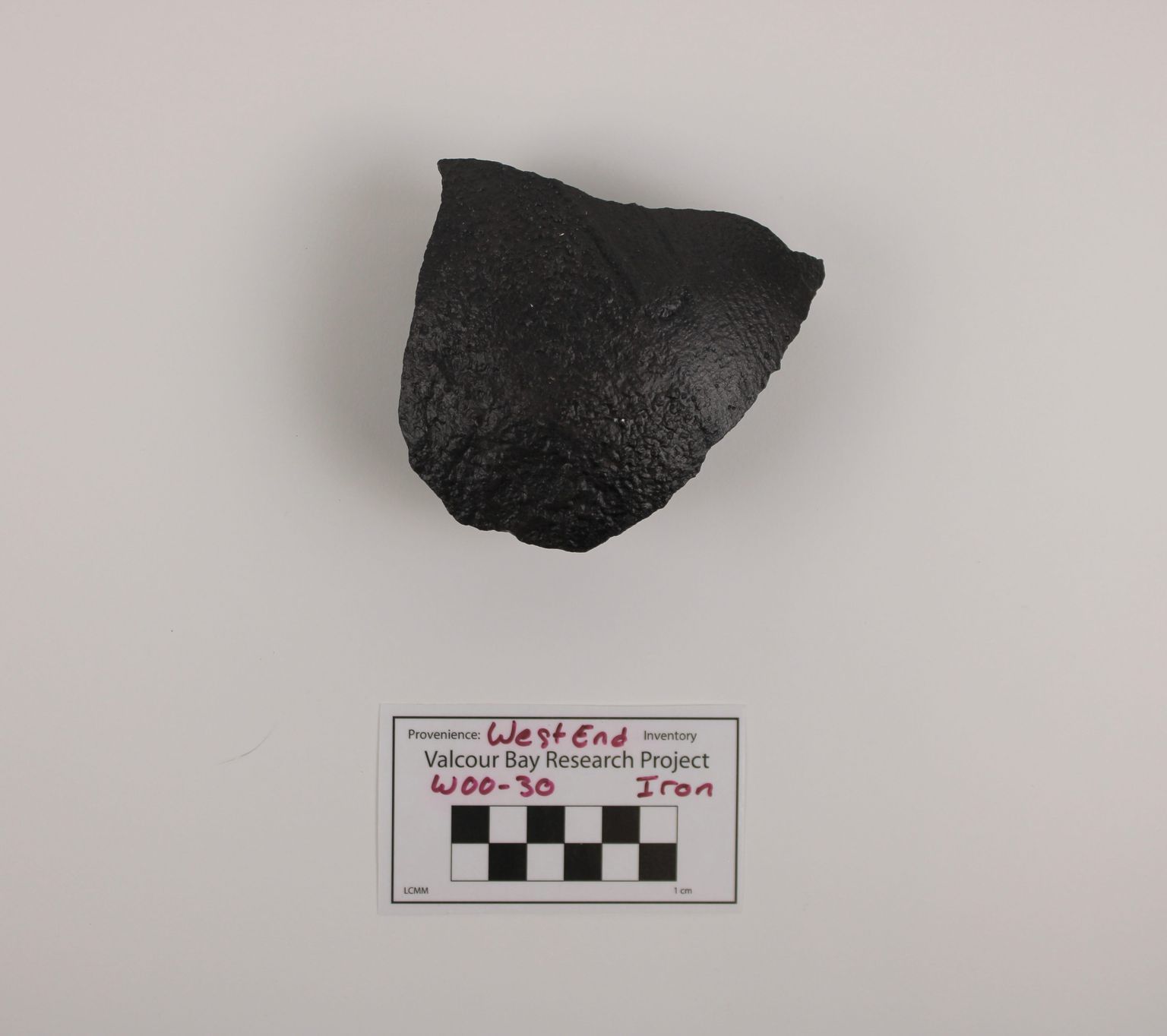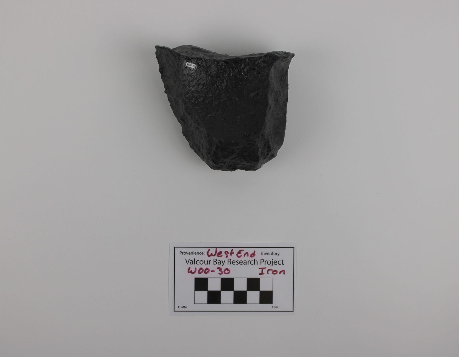 Artifact W00-30 is a fragment of a cast-iron 8-inch Howitzer Shell. This object has not been documented in detail. There is interior pitting. A marking bisects the fragment's exterior, with the surface smooth on one side and pitted on the other.