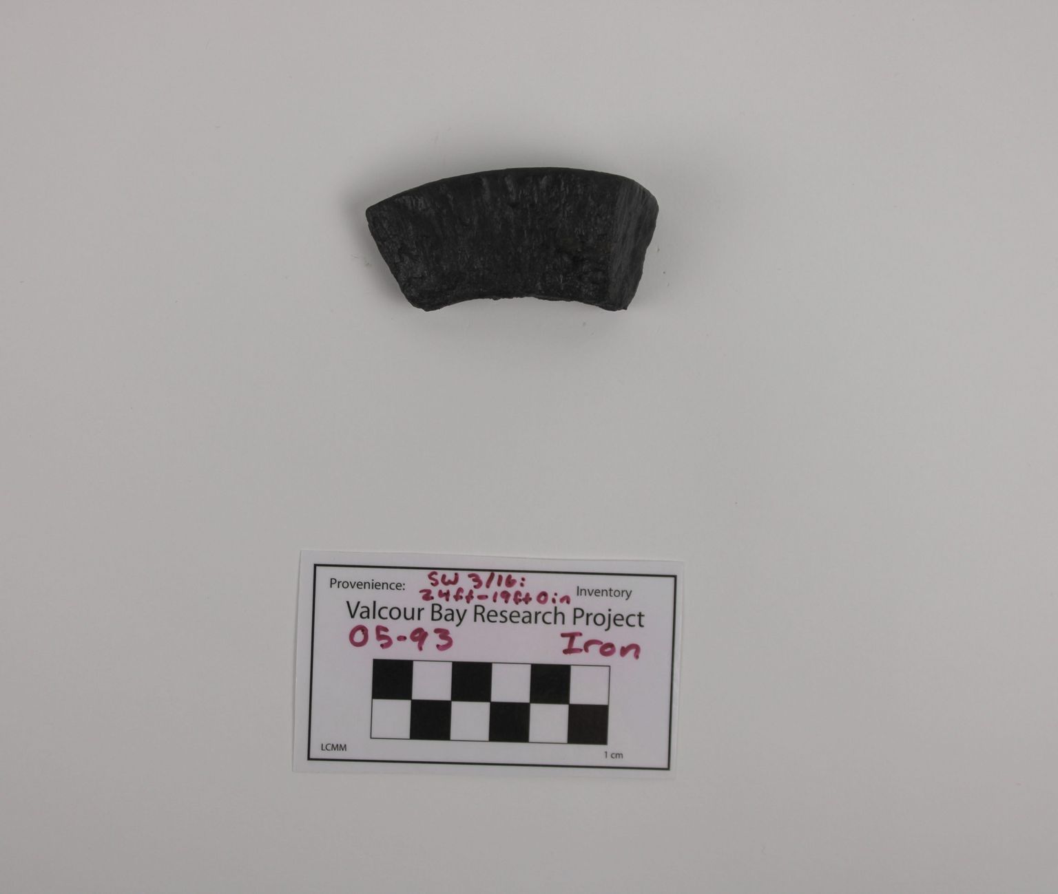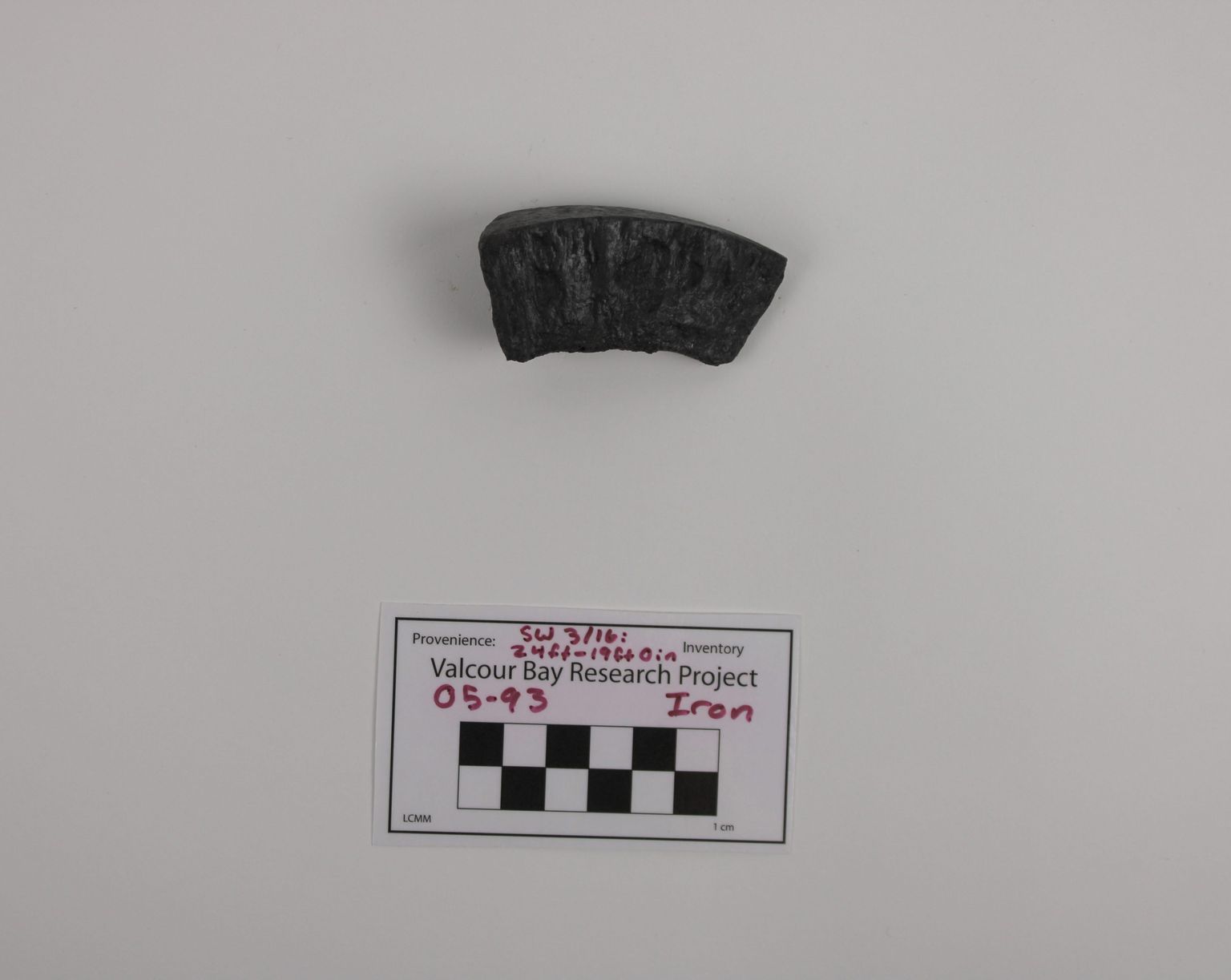 Artifact 05-93 is an unidentified iron fragment. It is roughly triangular in shape, with a smooth exterior with pitted interior.Collection