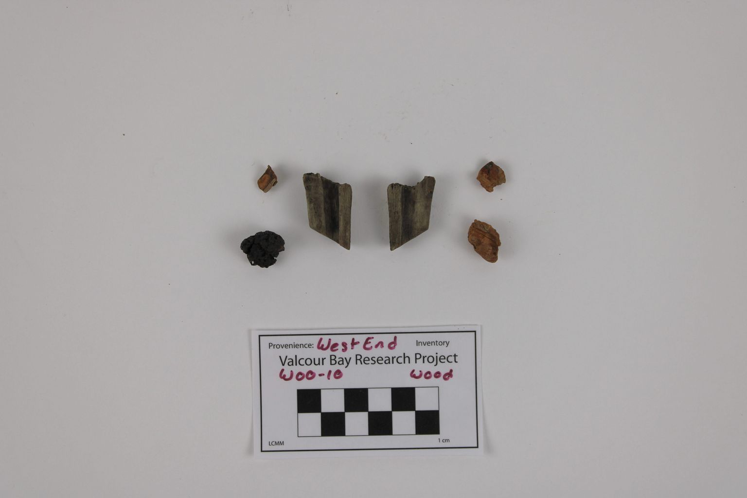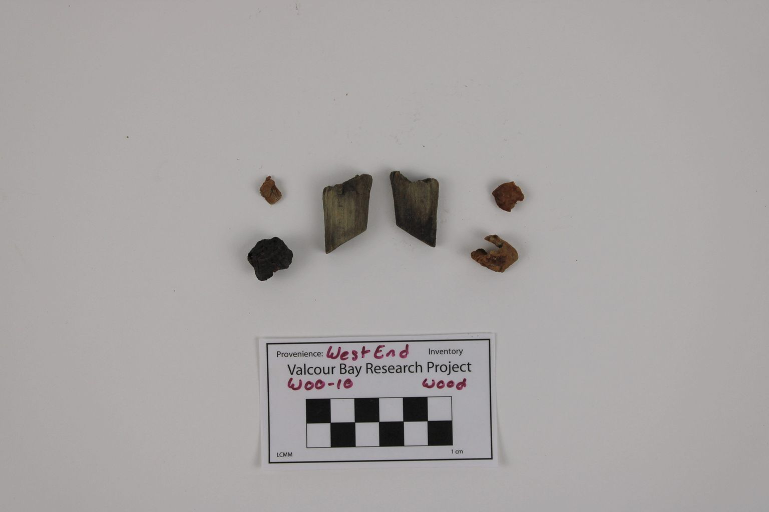 Six objects all less than 2cm in size, irregular wood fragments.