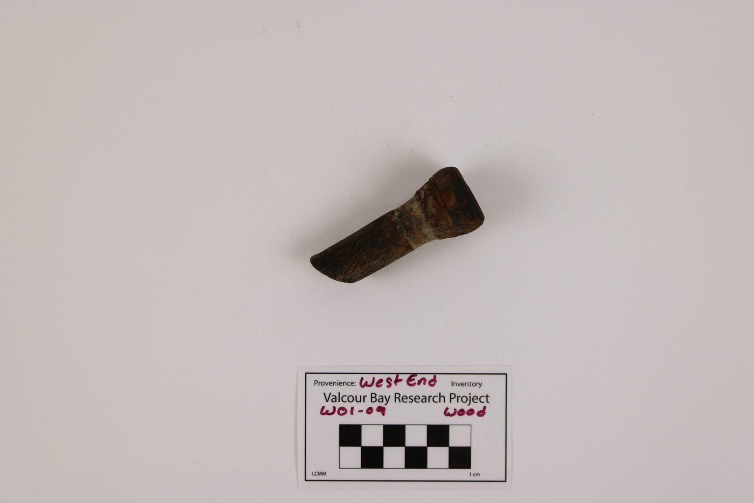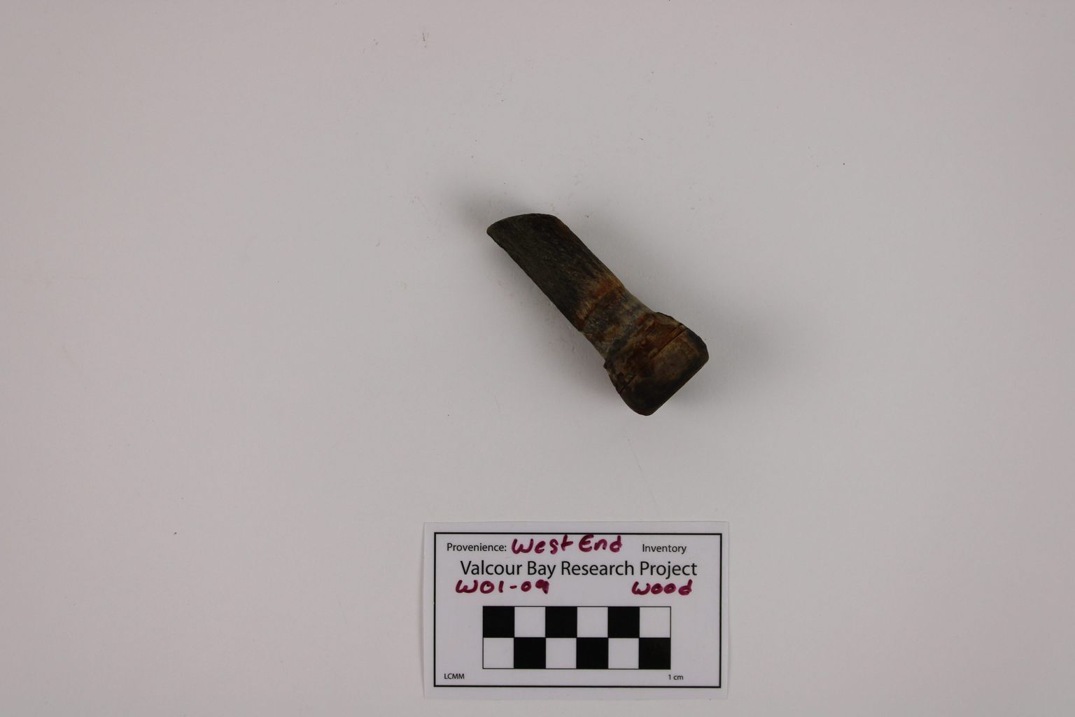 Artifact W01-09 is a small wooden fuse, intact, likely unused. Carved wood, different shades of brown and black that are textured. Some minor cracking around the edges of the head, angled end.