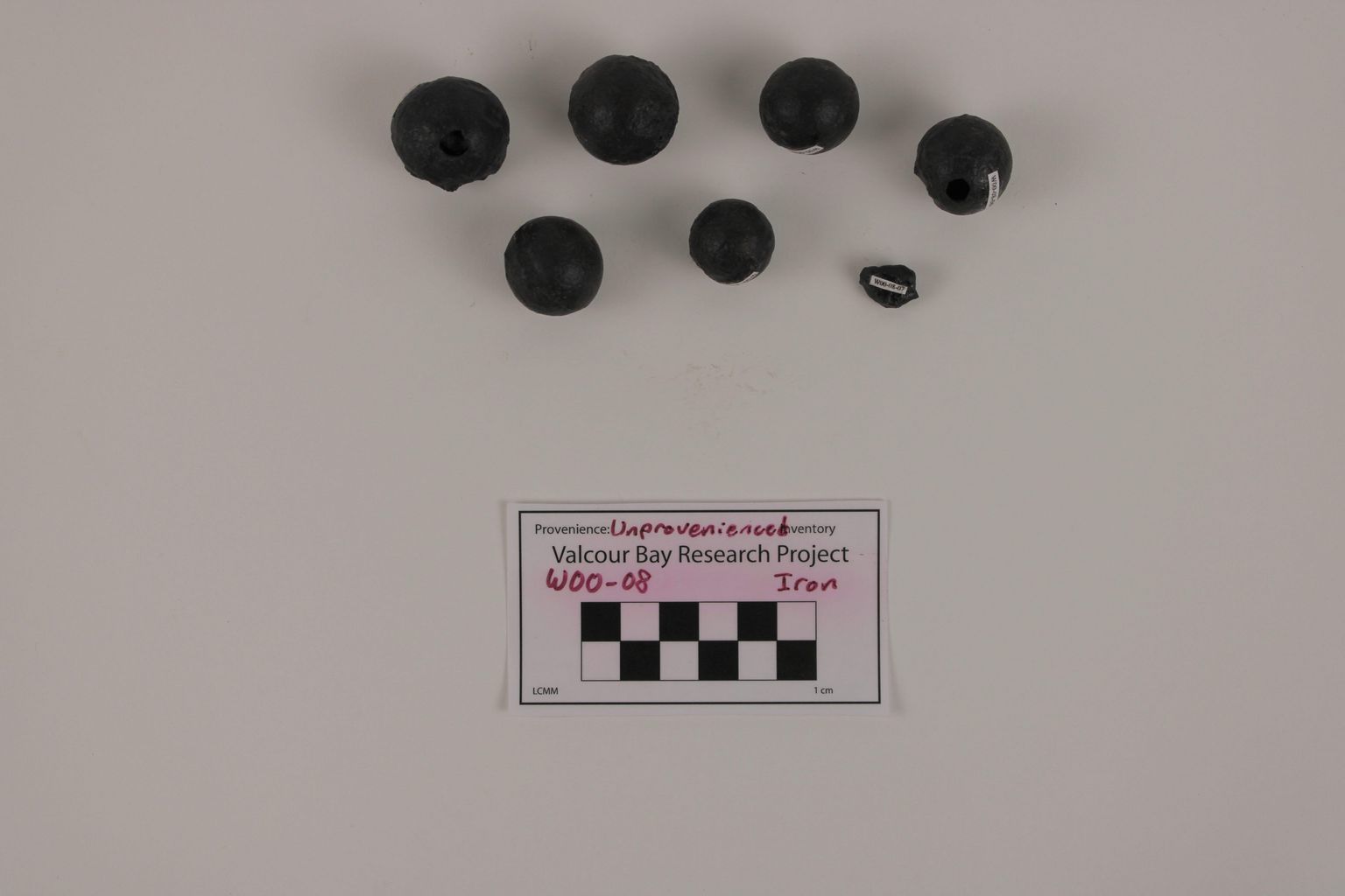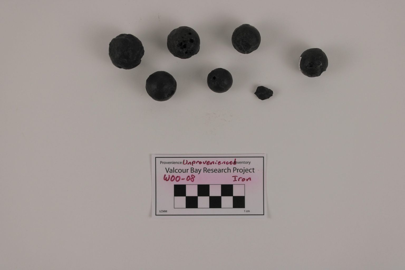 Artifact lot W00-08 are a collection of seven pieces of cast iron grape shot found in close proximity to each other. W00-08.01 is about half smooth and half pitted and uneven. W00-08.02 is quite smooth, but an imperfections in the casting process made it uneven. W00-08.03 is smooth with a small hole and is slightly irregular in shape. W00-08.04 is an irregularly shaped, rounded shot with a small hole on it and about half of its surface is pitted. W00-08.05 is heavily pitted on one side with evidence of casting imperfections. W00-08.06 has a large hole and is somewhat irregular and craggy in shape. W00-08.07 is a small smooth metal fragment.Collection