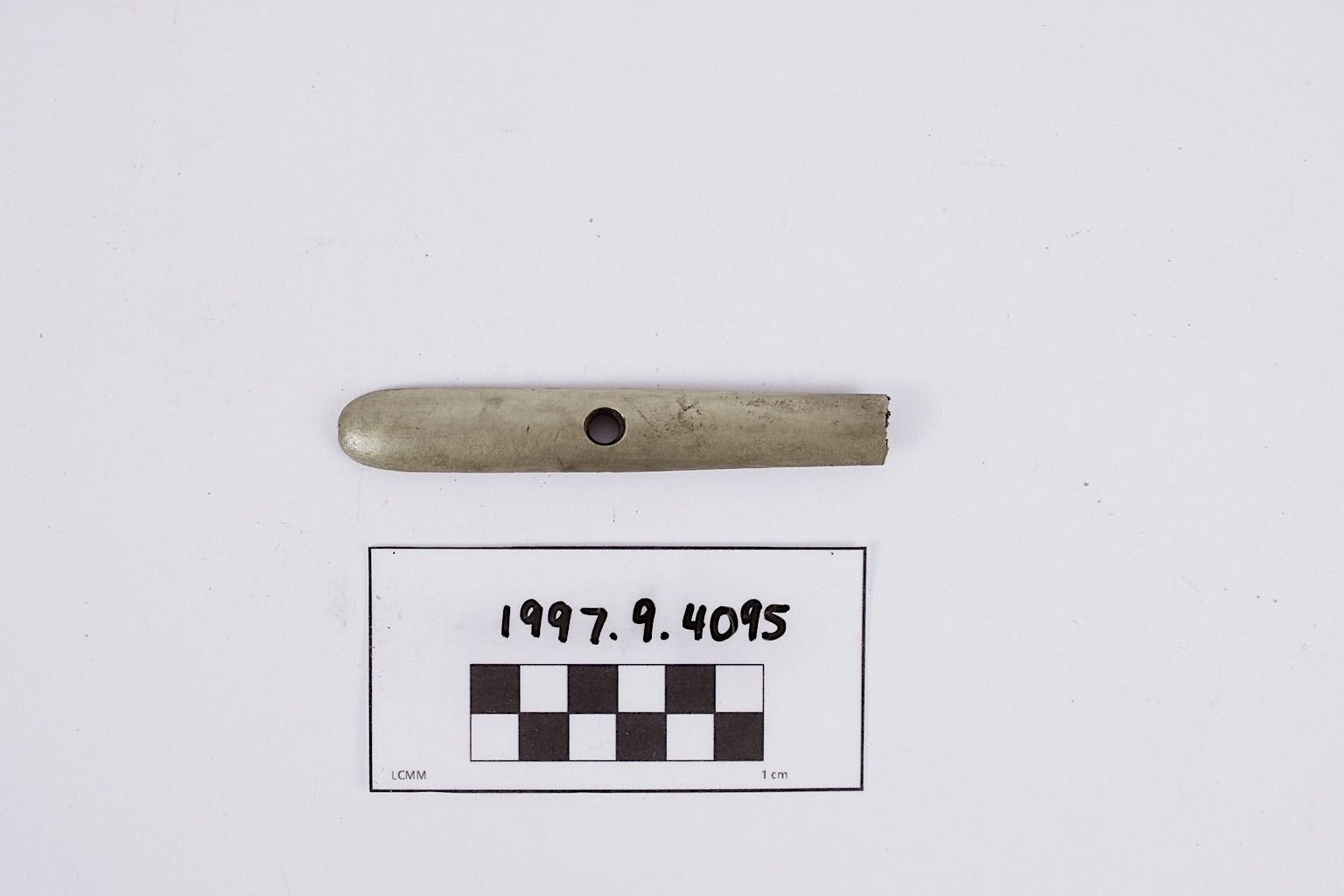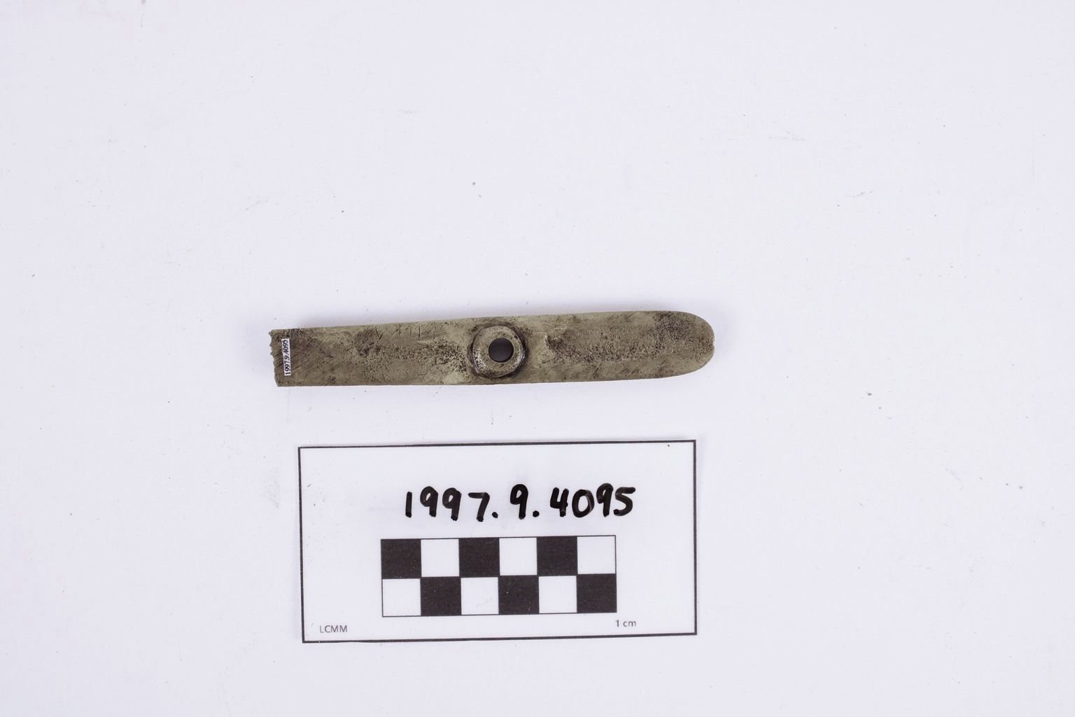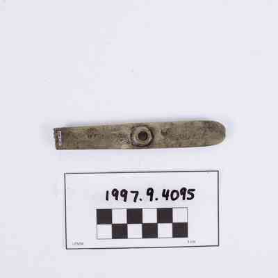 Artifact 1997.9.4095 is a fragment of the tail of a cupreous musket trigger guard.