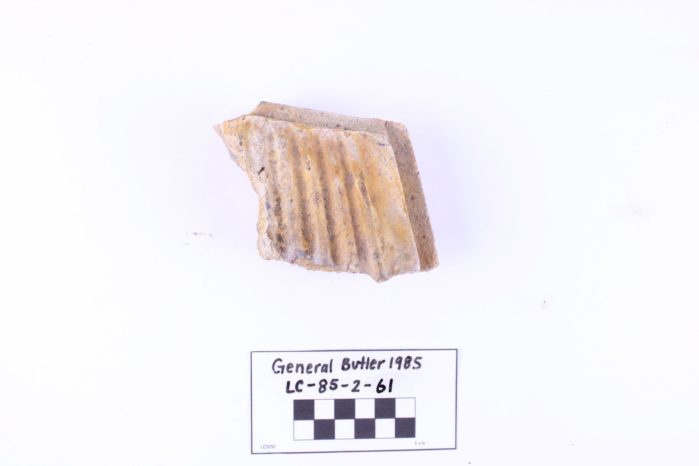 Artifact LC-85-2-61 is a pale piece of brick. There is a fluted texture carved along one side. The rest of the brick is smooth and flat.