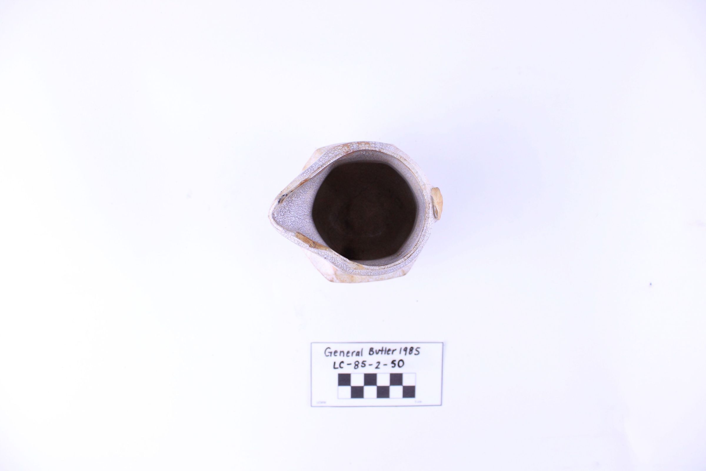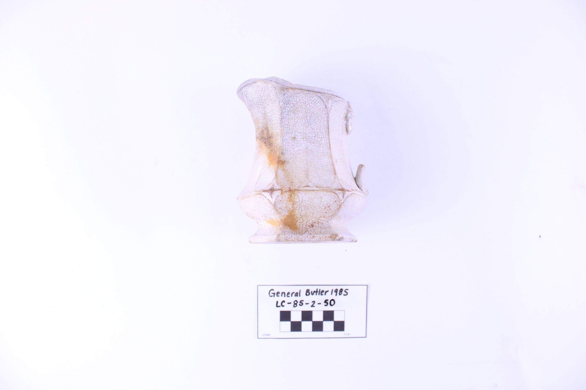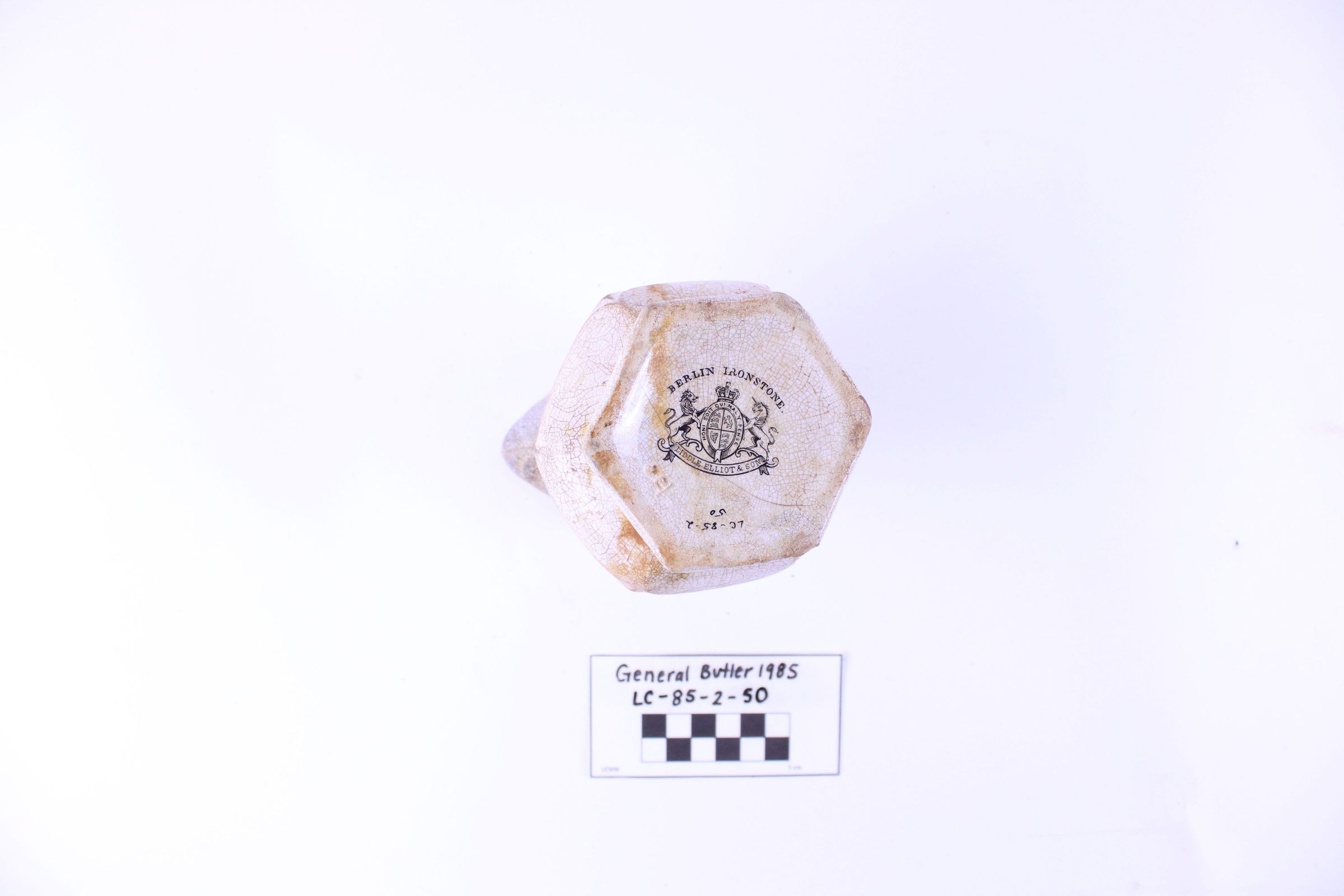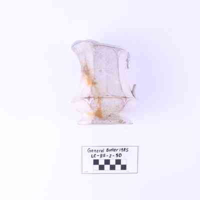 Object LC-85-2-50 is a creamer with a fluted body. A portion of the handle is missing. The base reads Liddle Elliot & Son.
