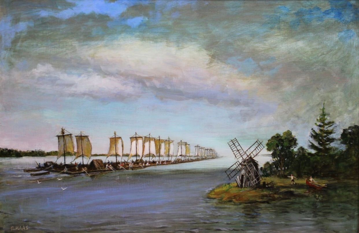 If reproduced, the credit line should read: Smuggling Timber, 1808. Ernest Haas, 2008. Acrylic on panel. 20in x 30in. Lake Champlain Maritime Museum Collection.