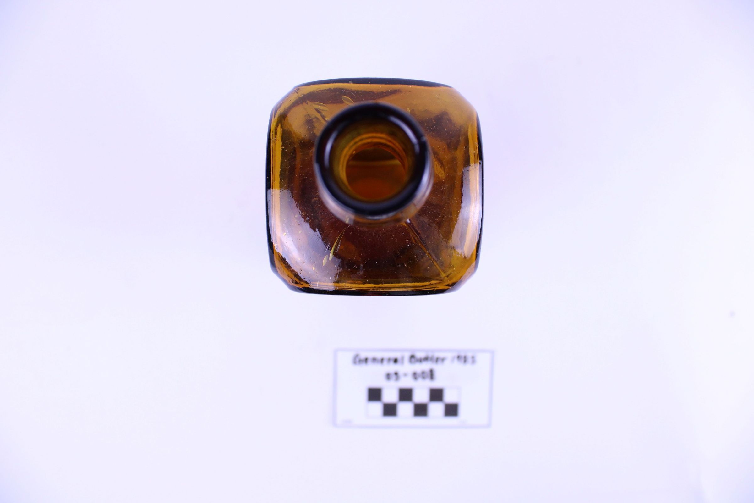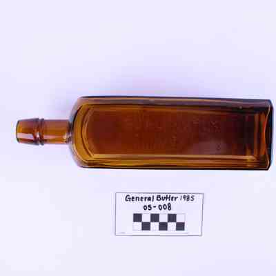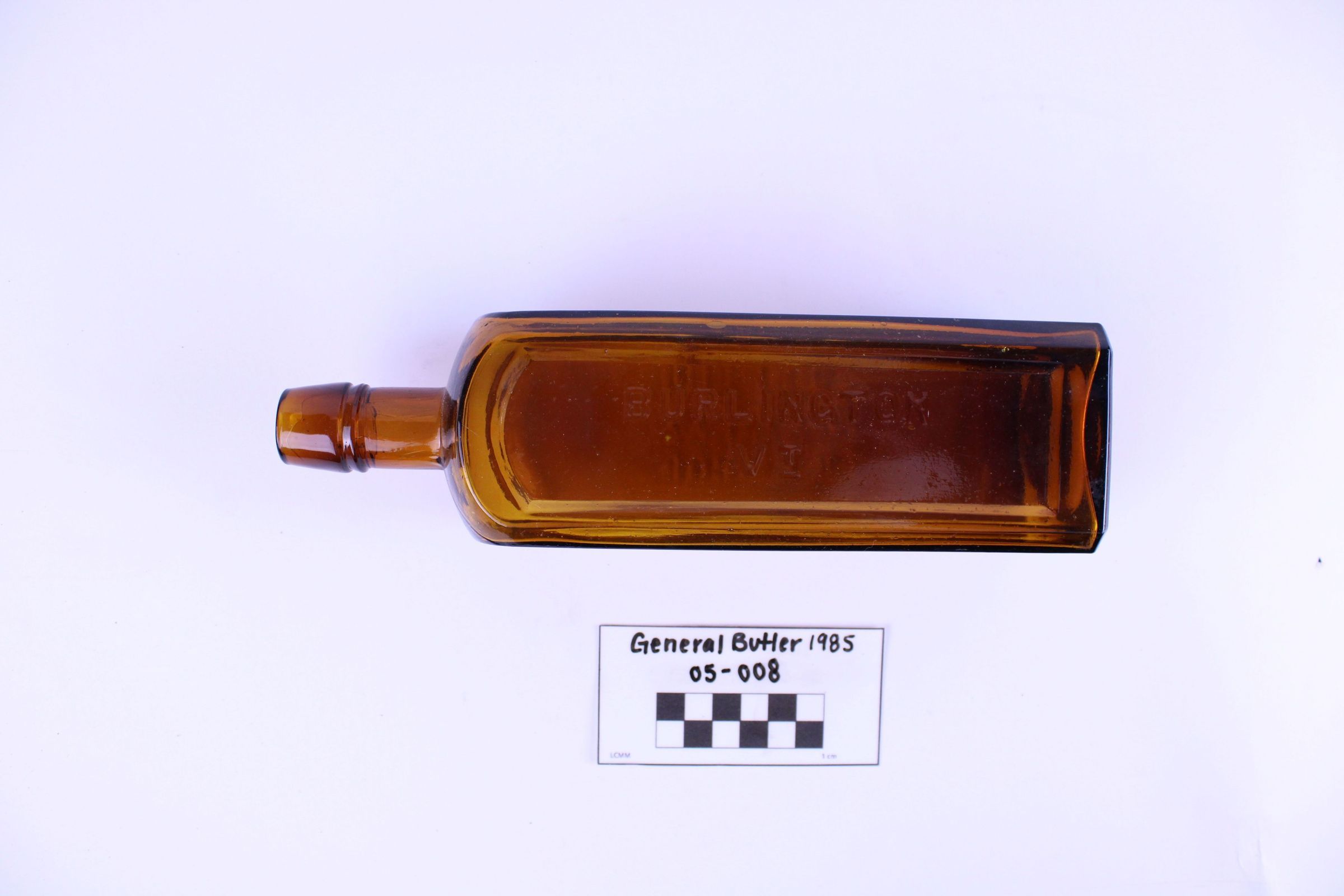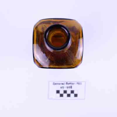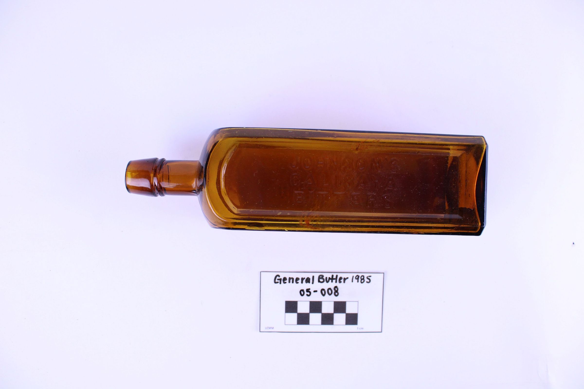 Artifact 05-008 is one (1) brown glass bottle with a square base and short neck. One side of the bottle is stamped with Johnson's Calisaya Bitters. The opposite side is stamped with Burlington VT.