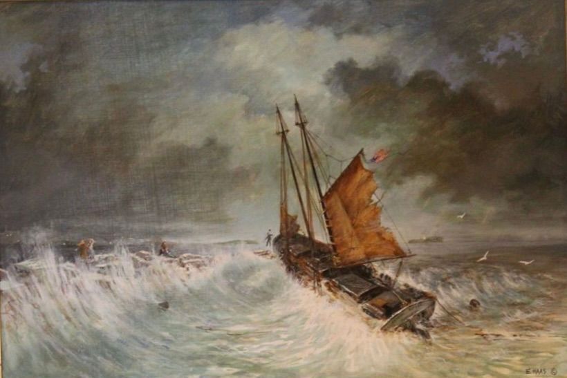 This painting depicts the fateful final voyage of the sailing canal boat General Butler. On December 9, 1876, General Butler was under the command of Captain William Montgomery of Isle La Motte. A powerful winter gale struck and upon approaching Burlington, Butler’s steering mechanism broke. The captain jury-rigged a tiller bar to the steering post and attempted to maneuver his craft around the breakwater. The attempt was unsuccessful and the schooner crashed headlong into the breakwater. The force of the water was so great that the vessel was repeatedly lifted on top of the ice-covered stones. One by one each of the ship’s company made the perilous jump onto the breakwater. The captain was the last to leave the ship which immediately sank into the 40′ of water where it now rests.
