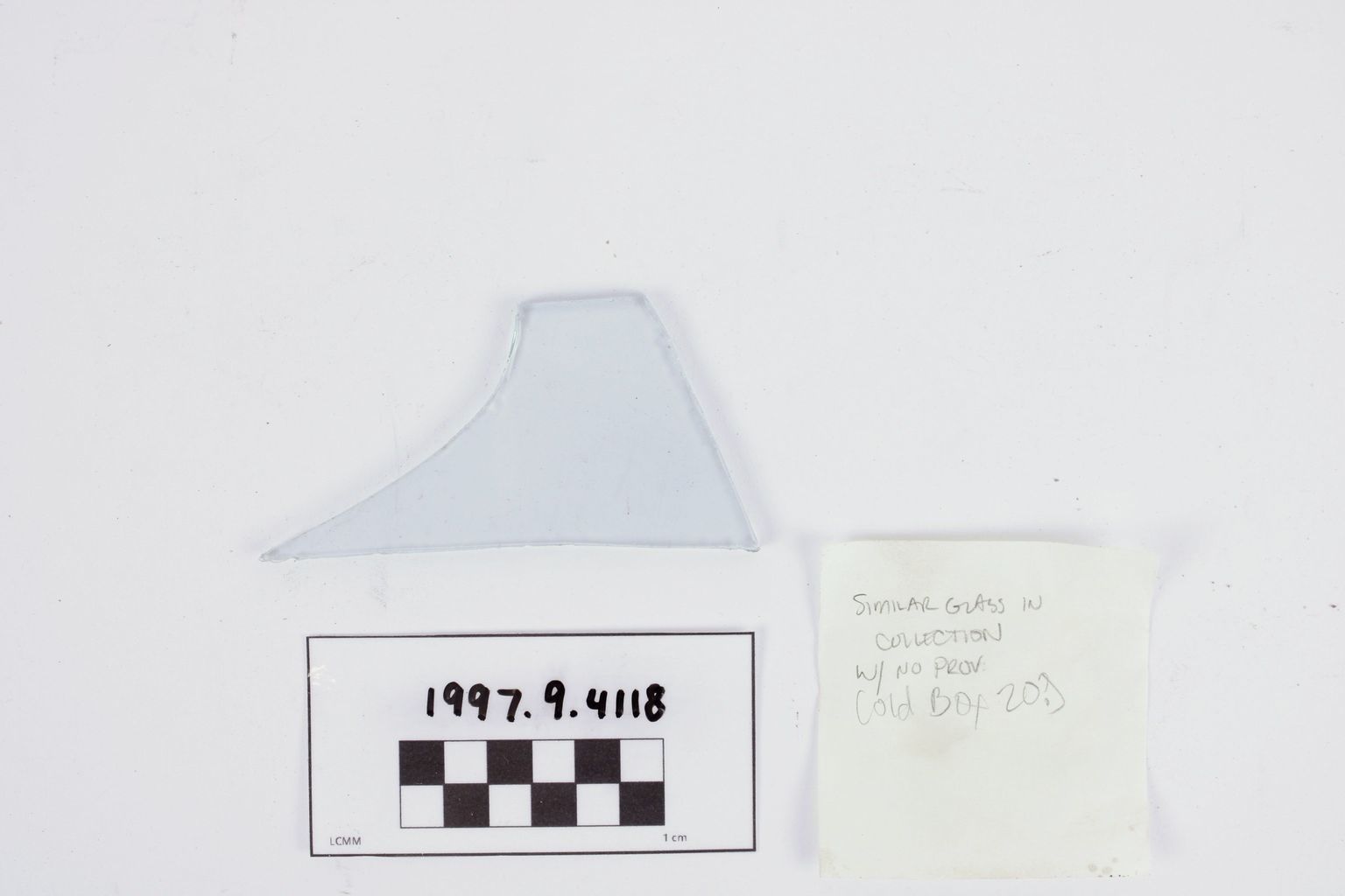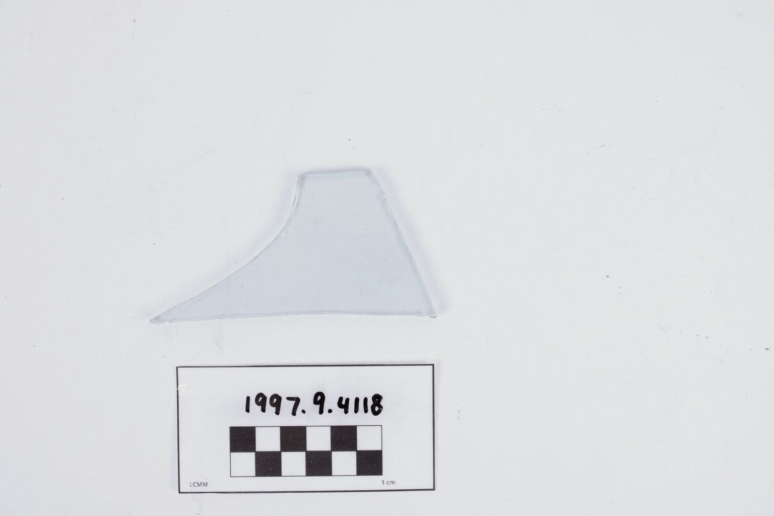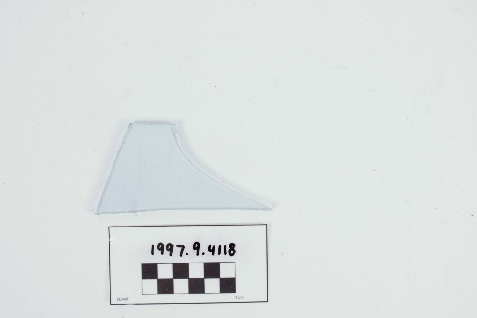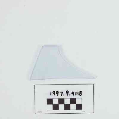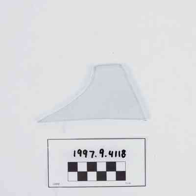 Artifact 1997.9.4118 is a fragment of blue-green flat window glass.