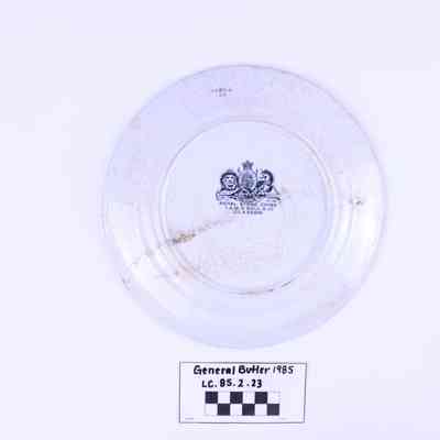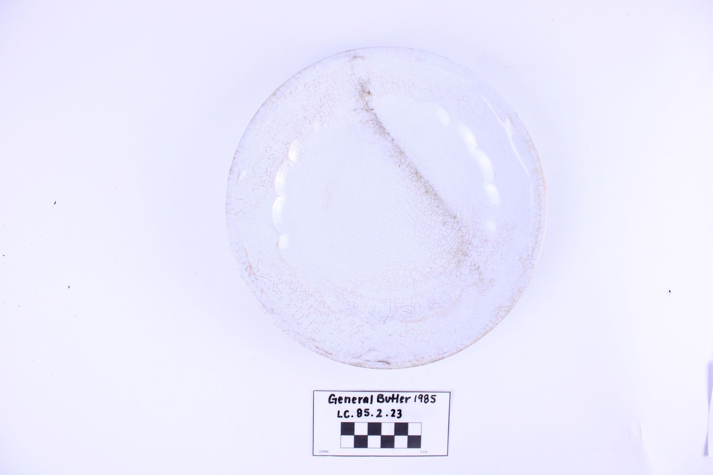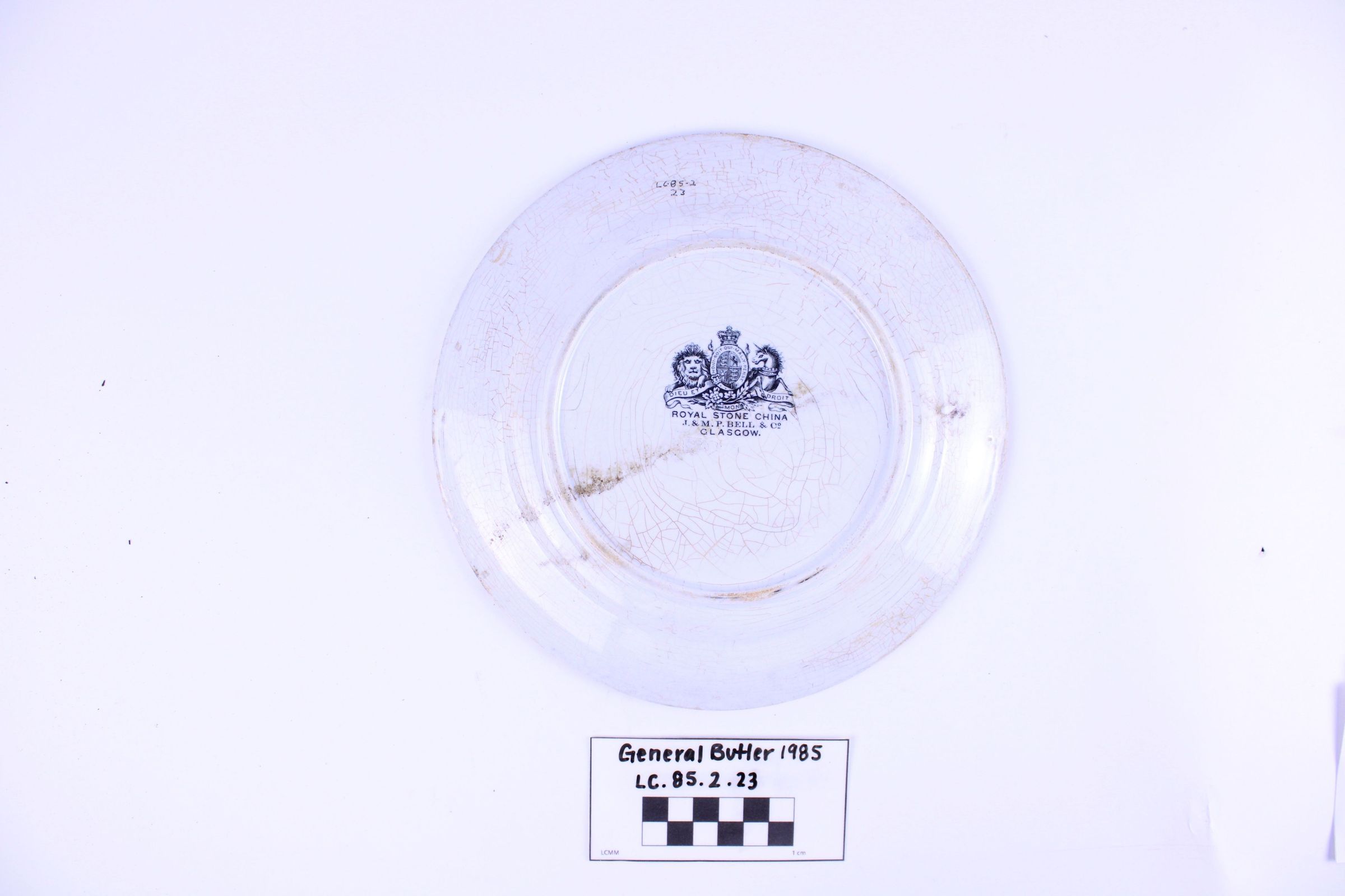 Artifact LC-85-2-23 is one (1) white ceramic plate with scalloped detail on inner setting. The plate has crazing across the surface and a thin brown line of discoloration across the face. The bottom is a white glaze with similar brown line. The makers mark depicts a lion and unicorn on either side of a crest, beneath are the words Royal Stone China J. & M.P. Bell & Co, Glasgow.