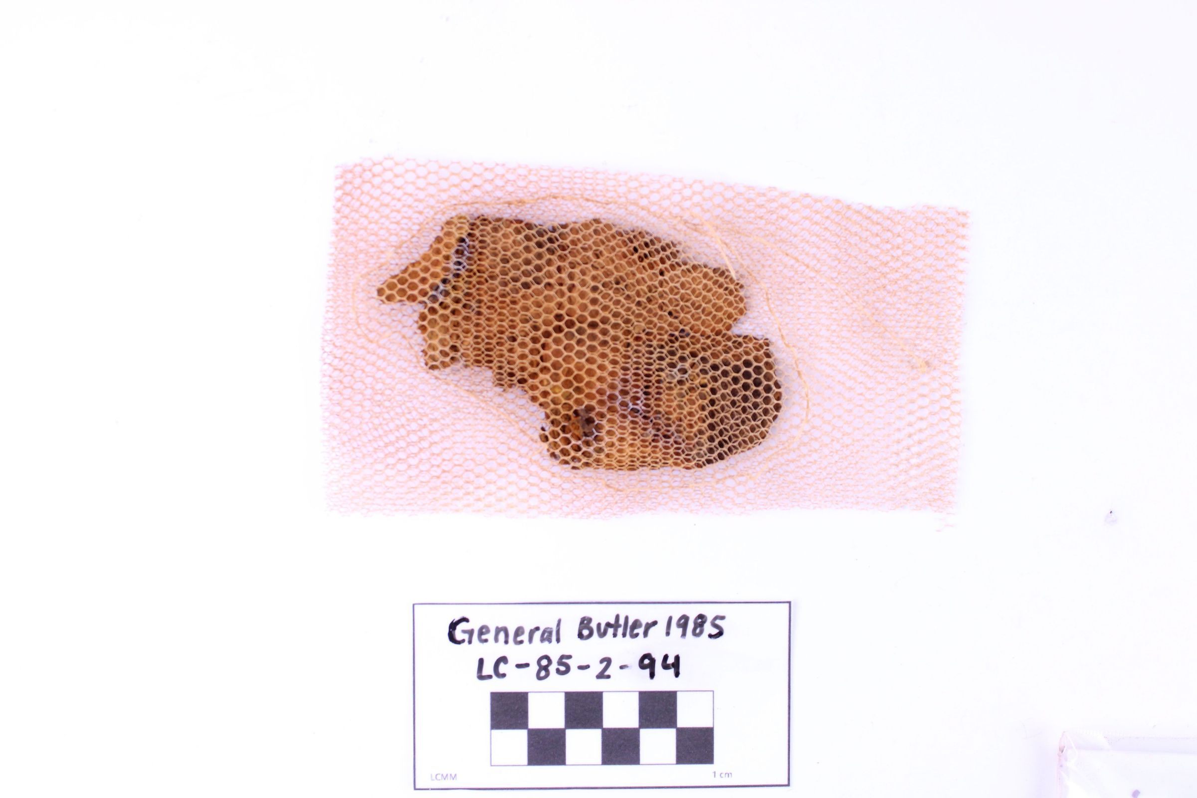 Artifact LC-85-2-94 is a fragment of textile. This piece is quite fragile, it has been stabilized by being encased in mesh. The fabric is brown and orange in color.Use