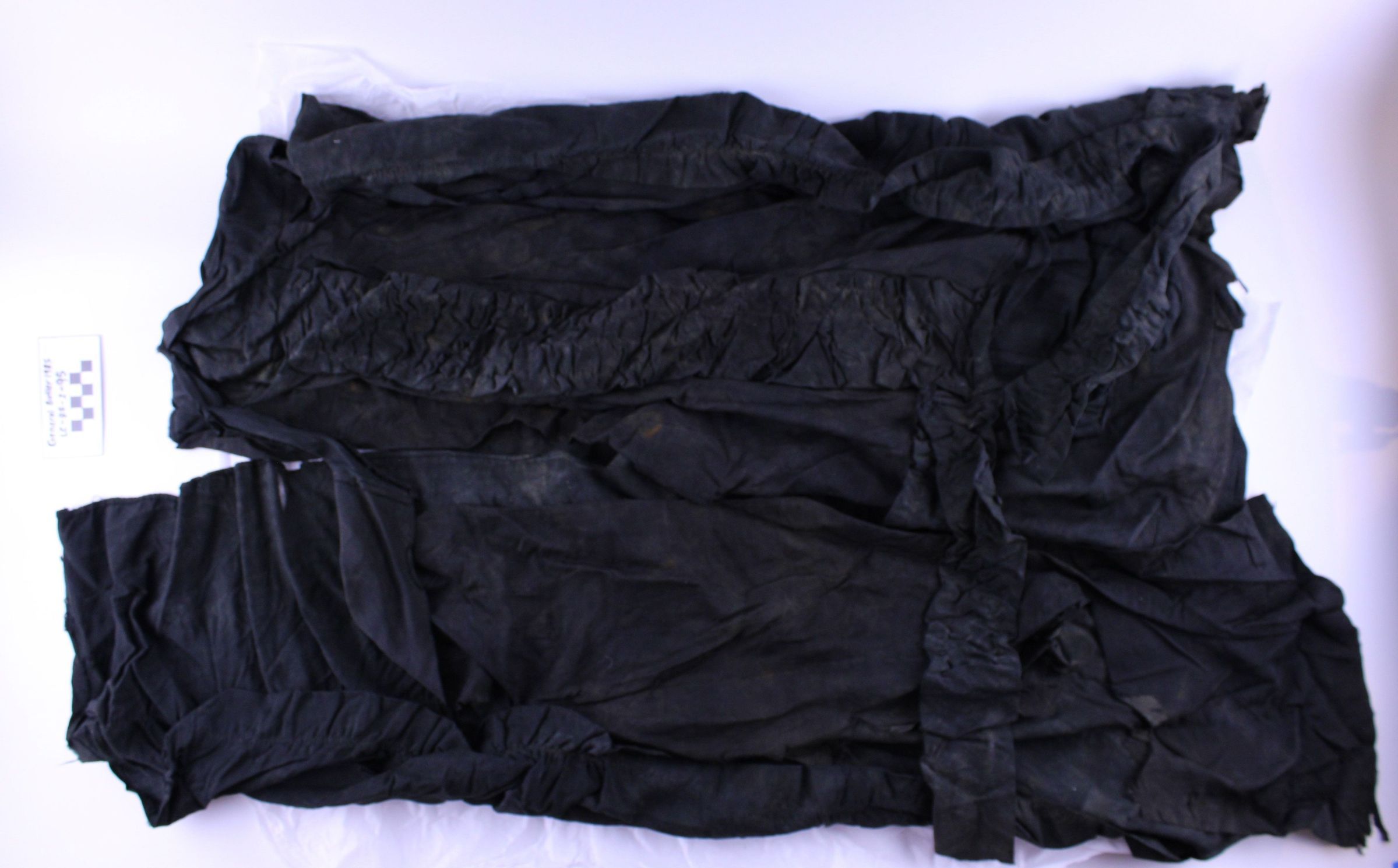 Artifact LC-85-2-95 is a floor length black cotton skirt. It has several strips of ruffles along the front of the skirt and pleats along the bottom hem. There are two splits down either side seam, perhaps where the ties of the skirt once were.