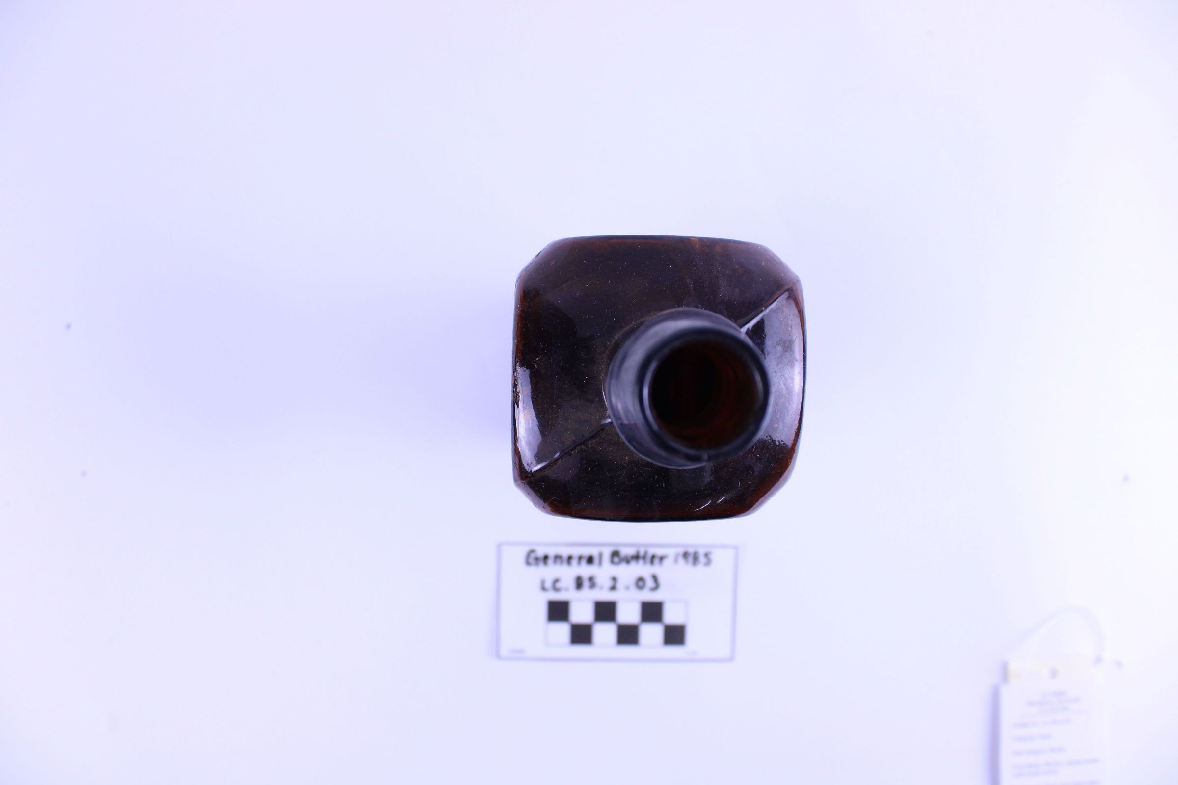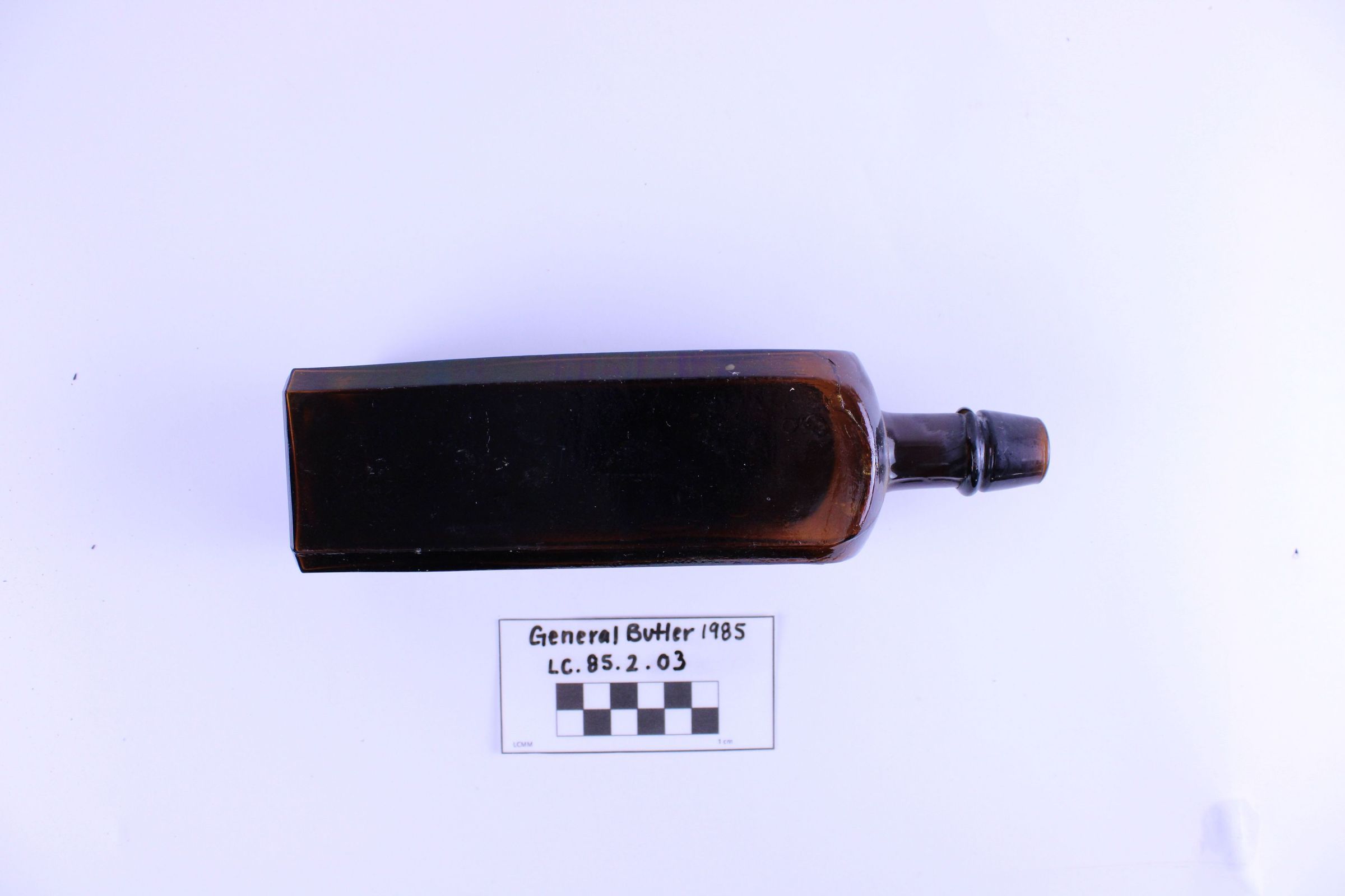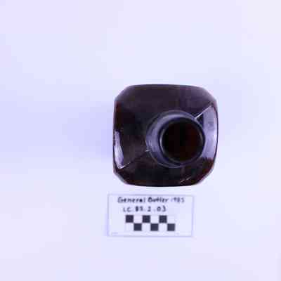 Artifact LC-85-2-03 is one (1) dark brown glass bottle with a wide square base and short neck. There is a large crack along the shoulder.