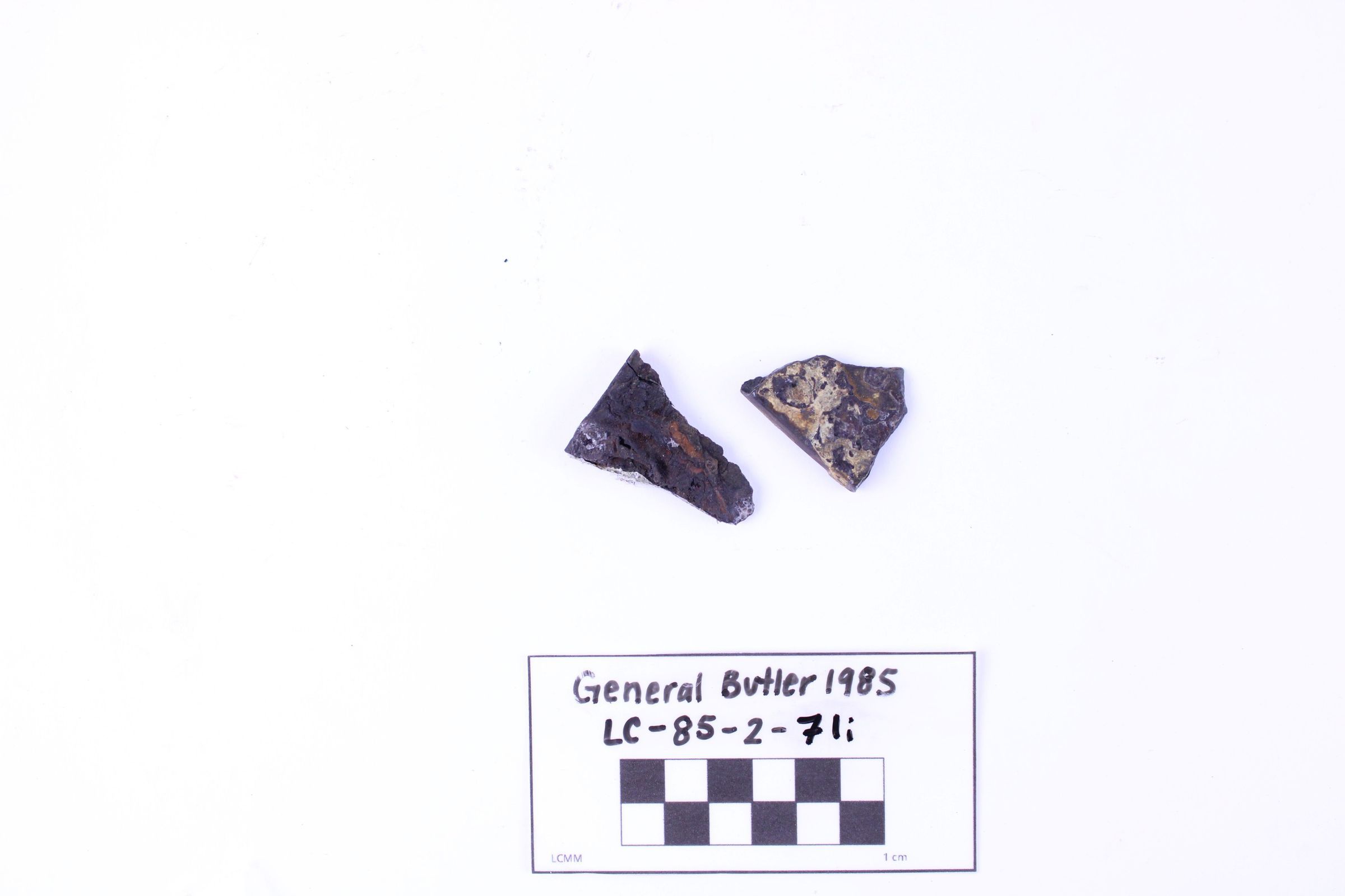 Artifact LC-85-2-71i is a lot of two (2) fragments of a large cast iron pot. These pieces have significant discoloration and wear.Use