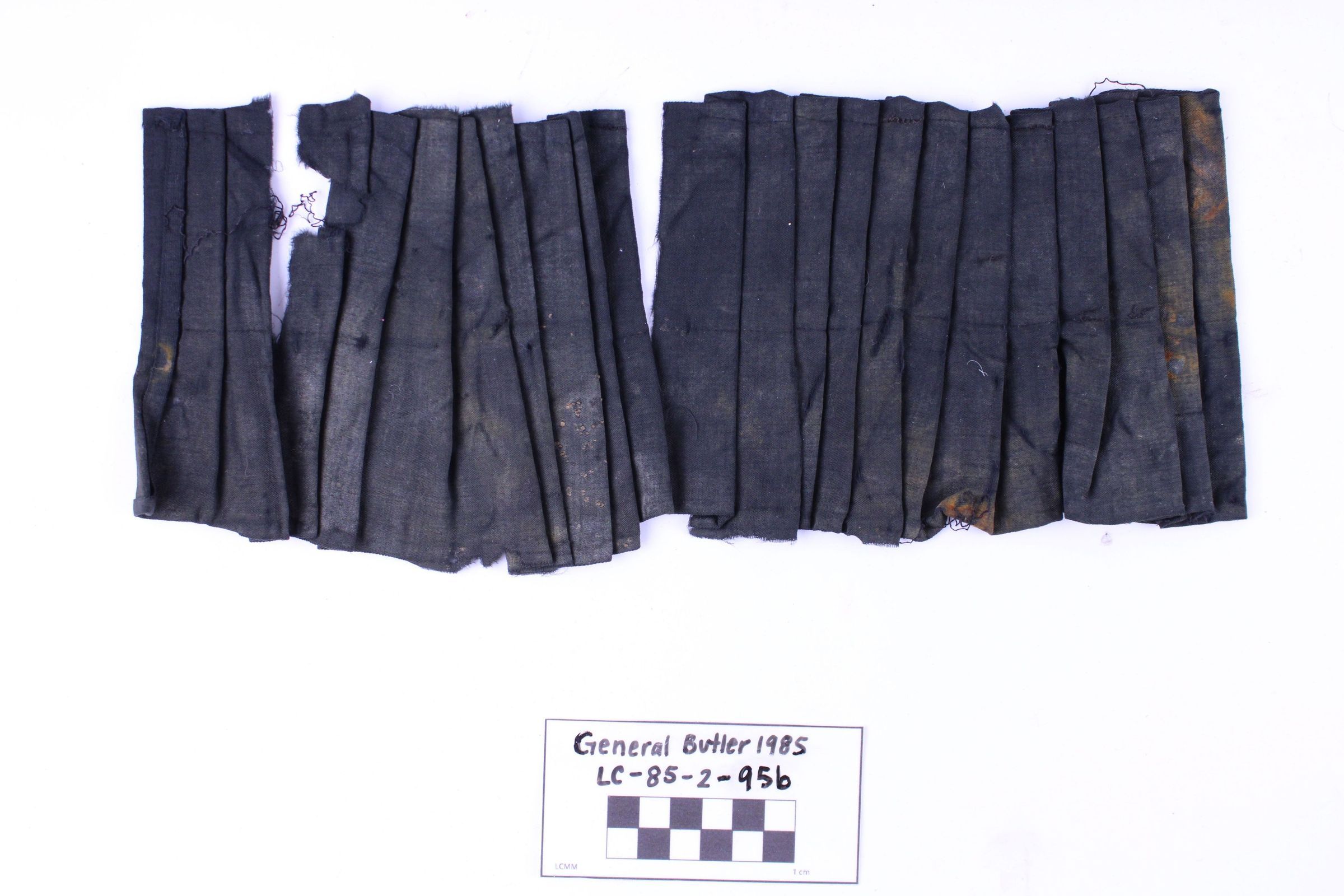 Artifact LC-85-2-95b is a section of pleated black cotton fabric from a walking skirt. There are several significant tears in the fabric as well as loose thread, orange discoloration, and color fading.
