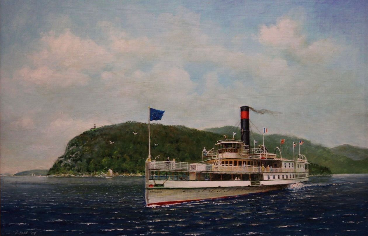 If reproduced, the credit line should read: Ticonderoga Underway. Ernest Haas, 2004. Acrylic on panel. 20in x 30in. Lake Champlain Maritime Museum Collection.