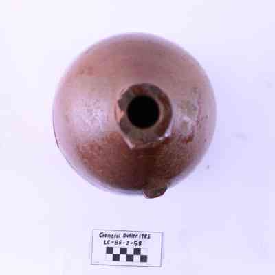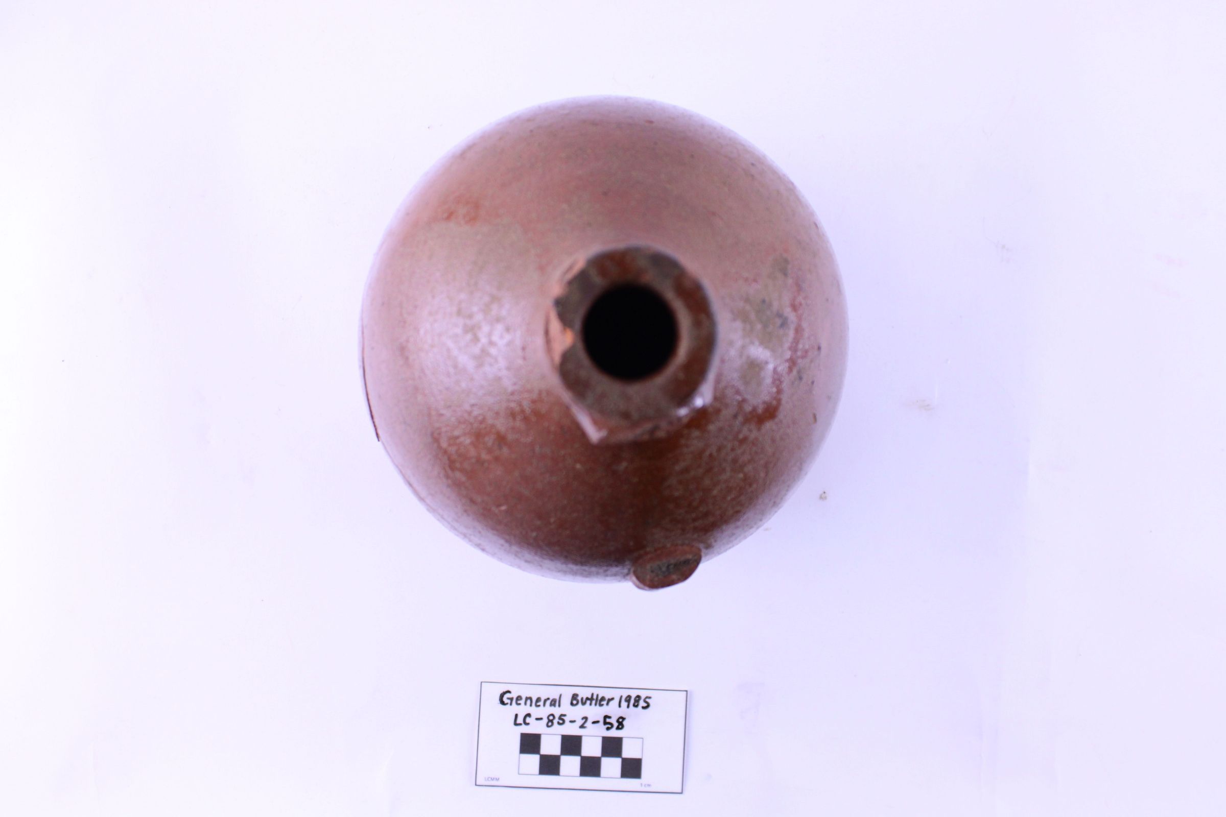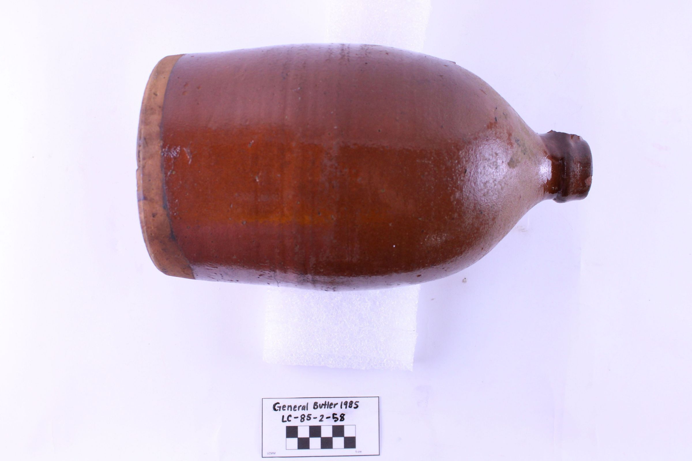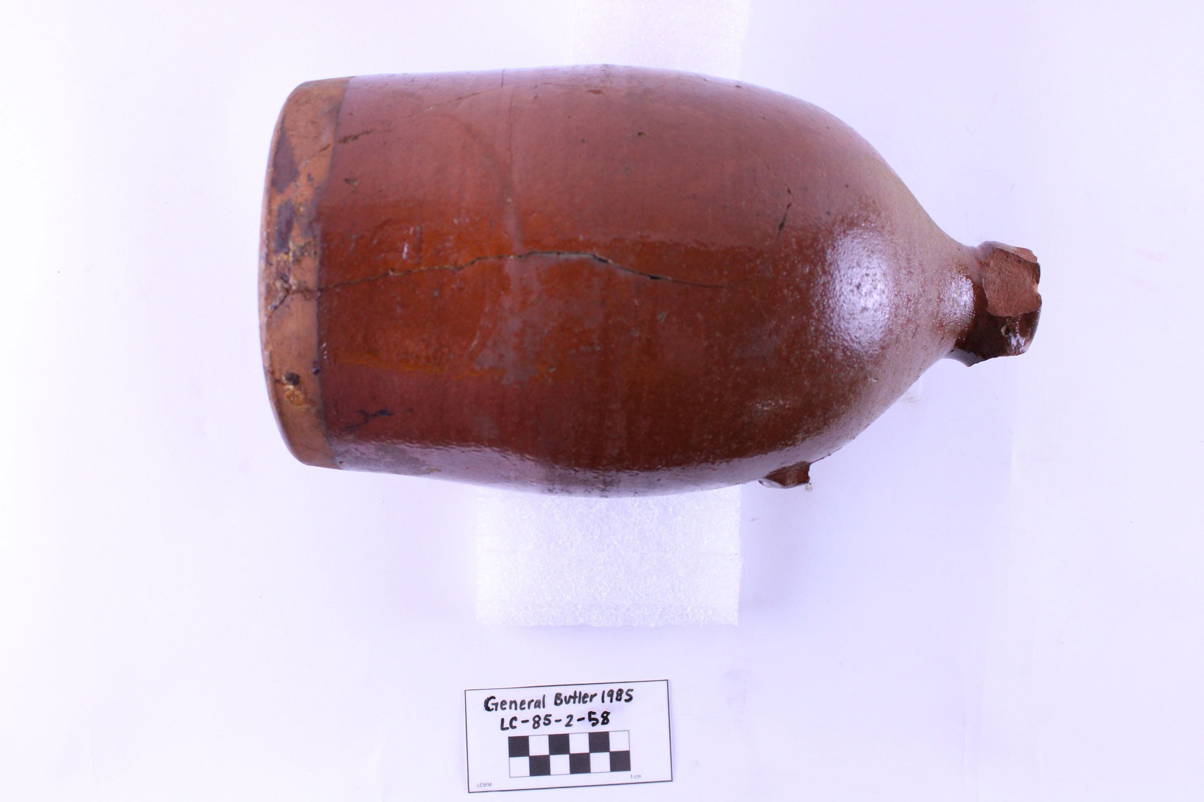 Artifact LC-85-2-58 is a large ceramic jug with a red glaze. There is a large crack along one side. The handle had broken off.