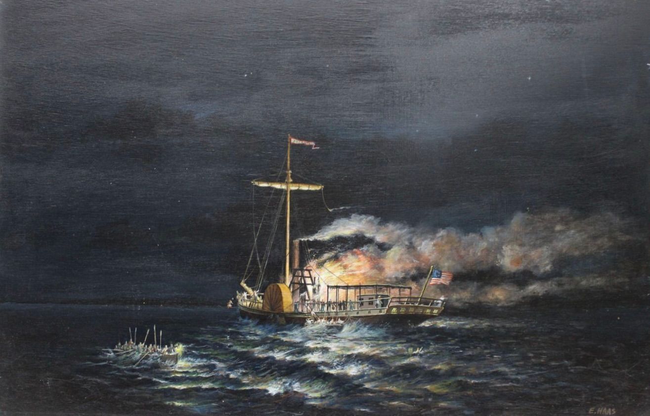 This unframed piece, titled Phoenix Sinking, depicts the 1819 fire that destroyed the Phoenix steamboat. The Phoenix was the second commercial steamboat to be used in Lake Champlain, traveling between New York and Quebec, among other ports. While the ultimate cause is debated, the fire that broke out on the night of September 4, 1819 was discovered too late to be extinguished in time to save the ship. Many of the ship’s passengers and crew were able to escape the blaze by two small rowboats. The rushed escape unfortunately left a dozen people (including the captain) behind on a rapidly sinking ship. Only Captain Sherman and five others were able to be saved the following morning.Subject Place