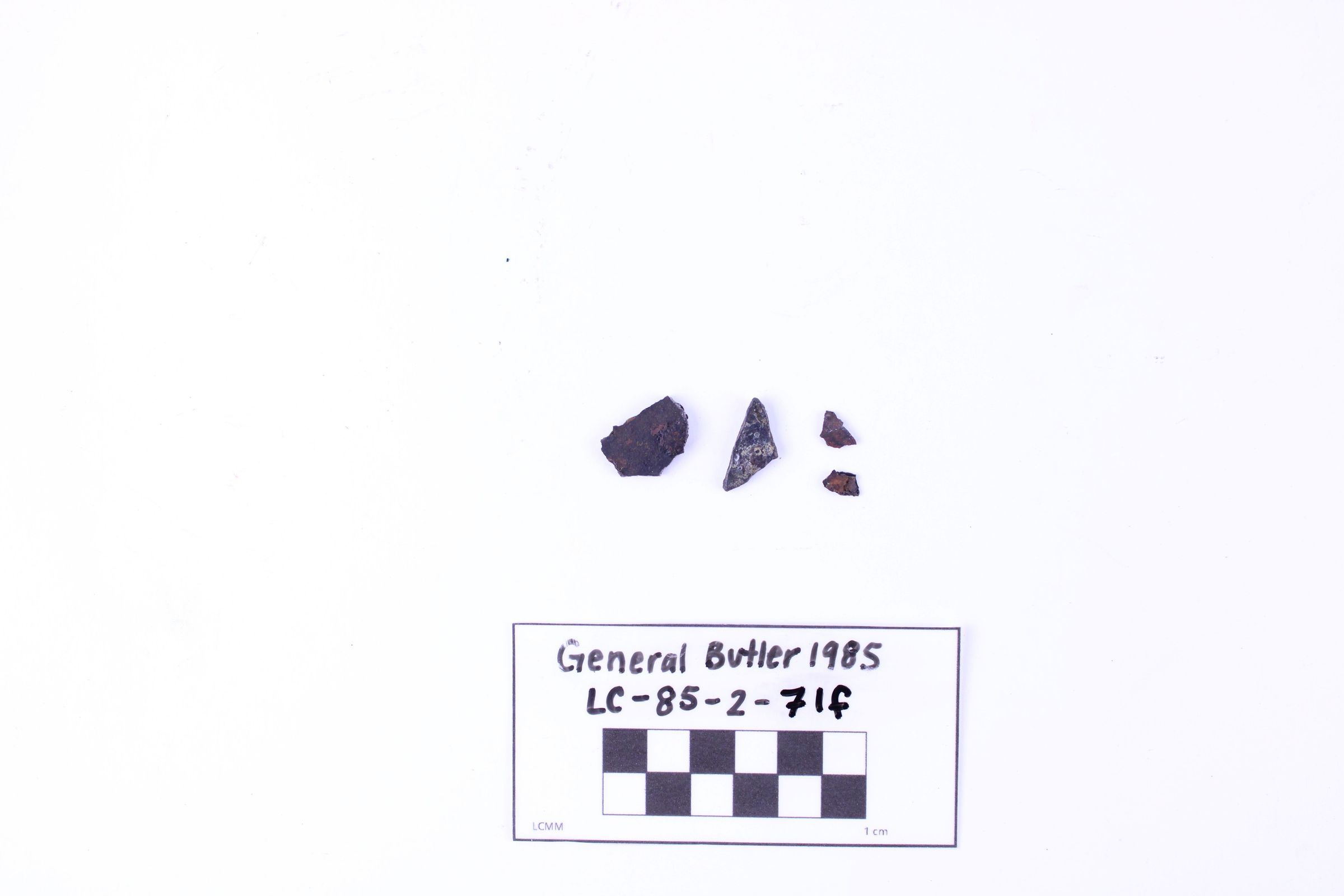 Artifact LC-85-2-71f is a lot of four (4) small fragments of a large cast iron pot.