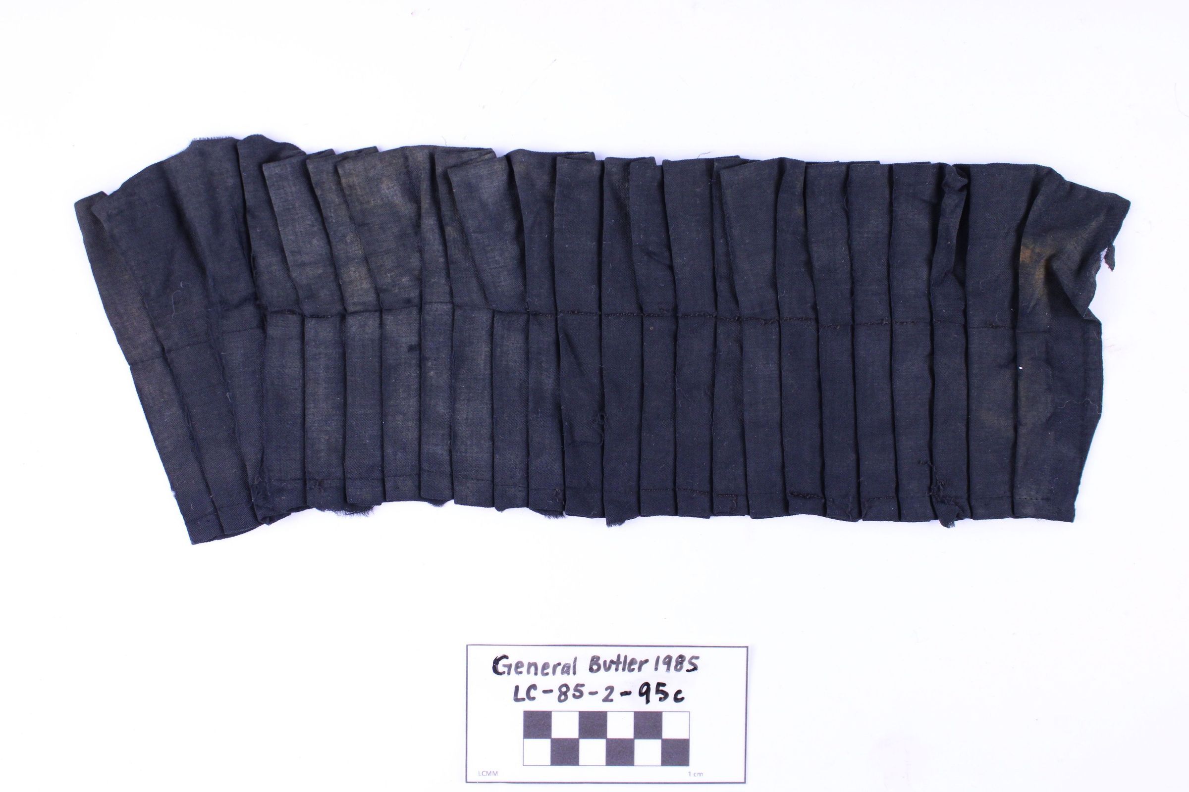 Artifact LC-85-2-95c is a section of pleated black cotton fabric from a walking skirt. There is a small tear along one edge of the fabric as well as color fading throughout.