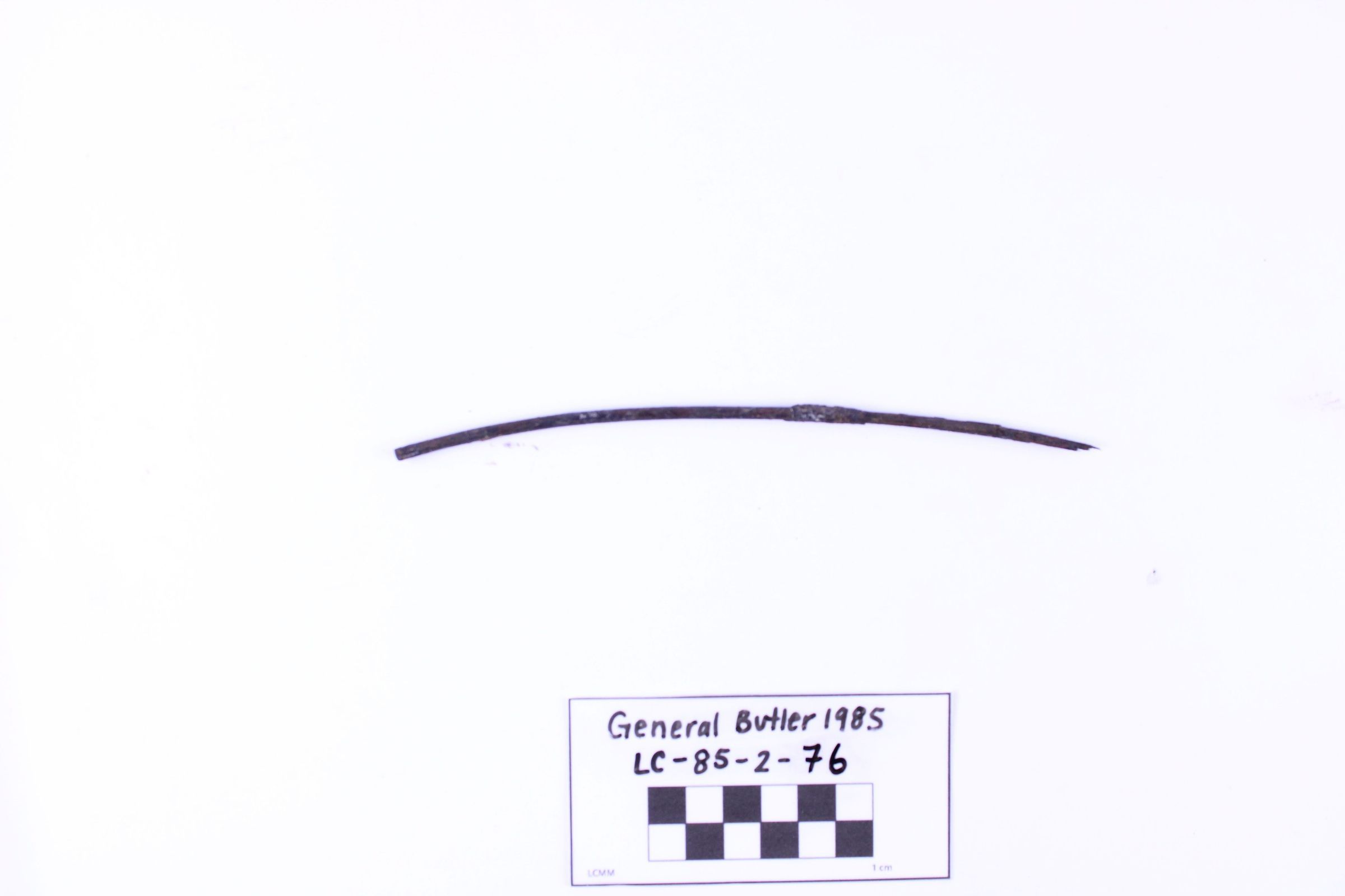 Artifact LC-85-2-76 is a thin fragment of a metal strap. It is curved and roughly broken on one end.