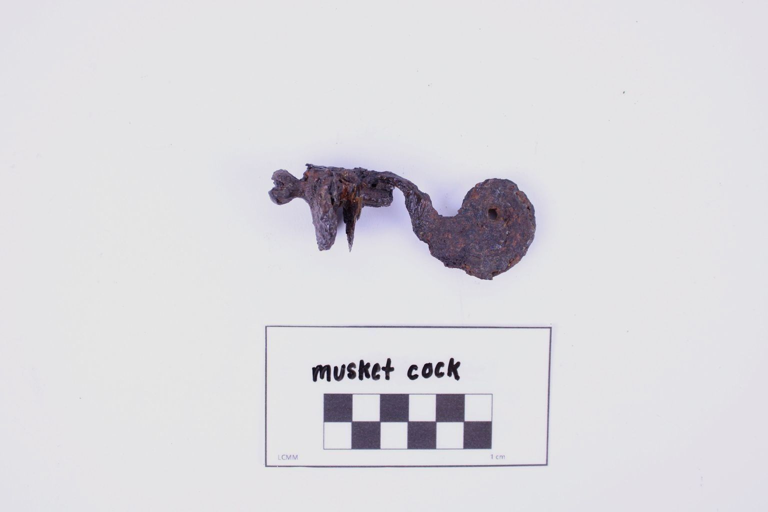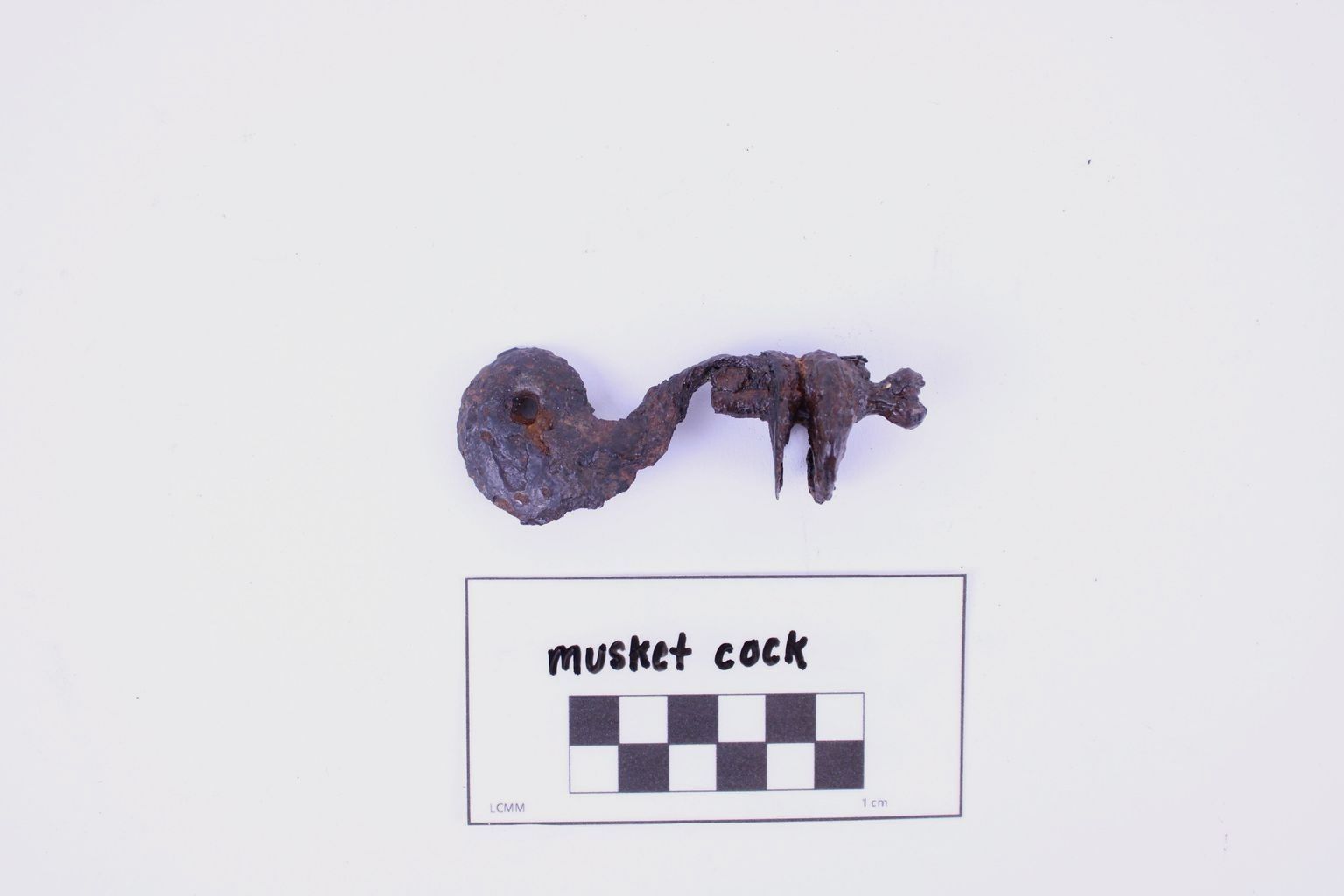 L-shaped piece of metal hinged at the front used in flint lock of firearms. The lock is held in one of two positions, opened or closed, by a spring
