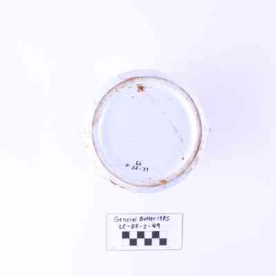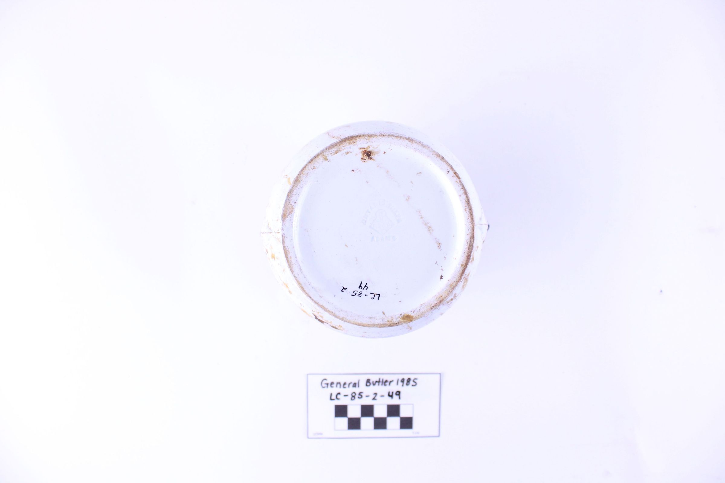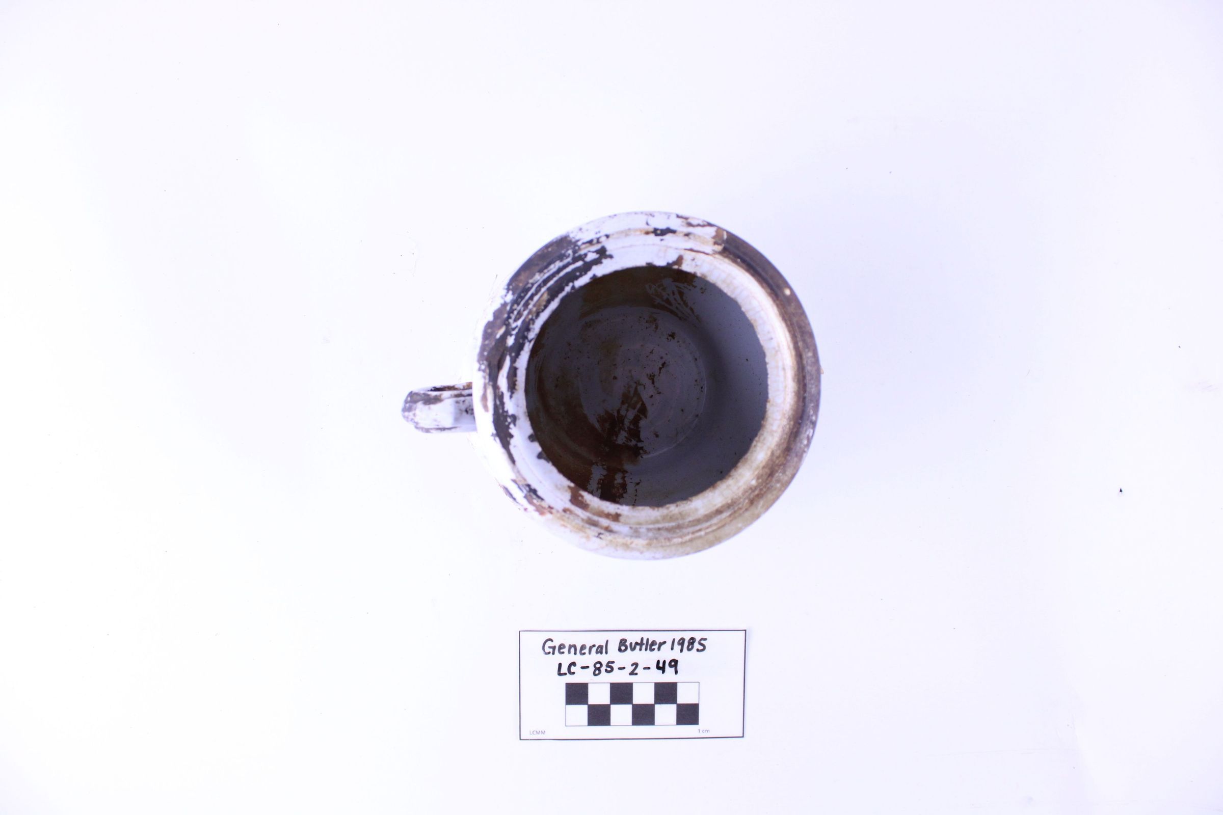 Artifact LC-85-2-49 is one (1) white ceramic sugar bowl. The bowl has two handles, with one cracked off and the lid missing. The bowl has a floral pattern. There are many small chips and cracks are present along with large patches of brown discoloration on the rim, interior, and exterior.