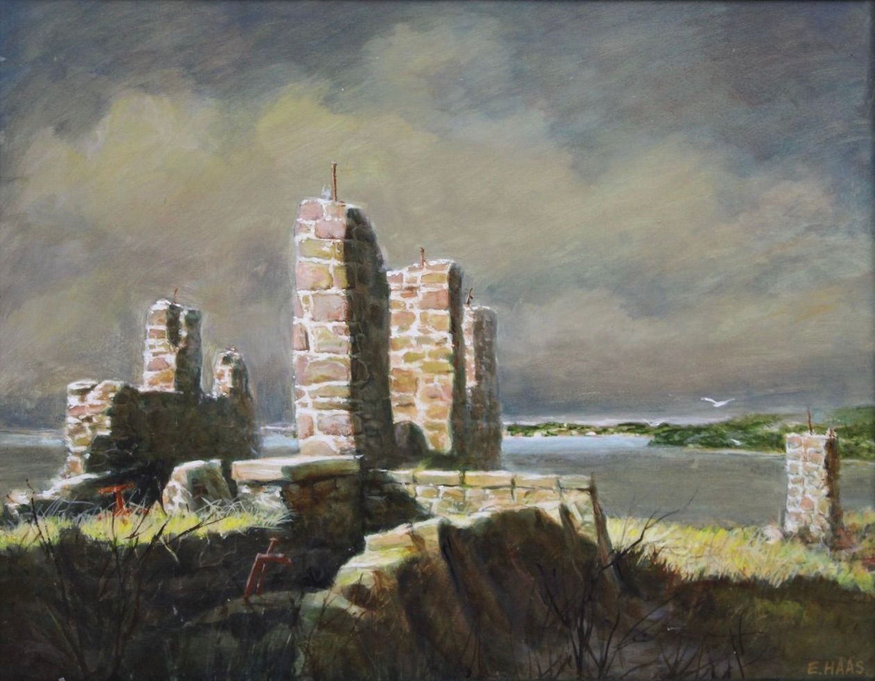 If reproduced, the credit line should read: Ruins Near Gloucester MA. Ernest Haas, 1987. Acrylic on panel. 16in x 20in. Lake Champlain Maritime Museum Collection.