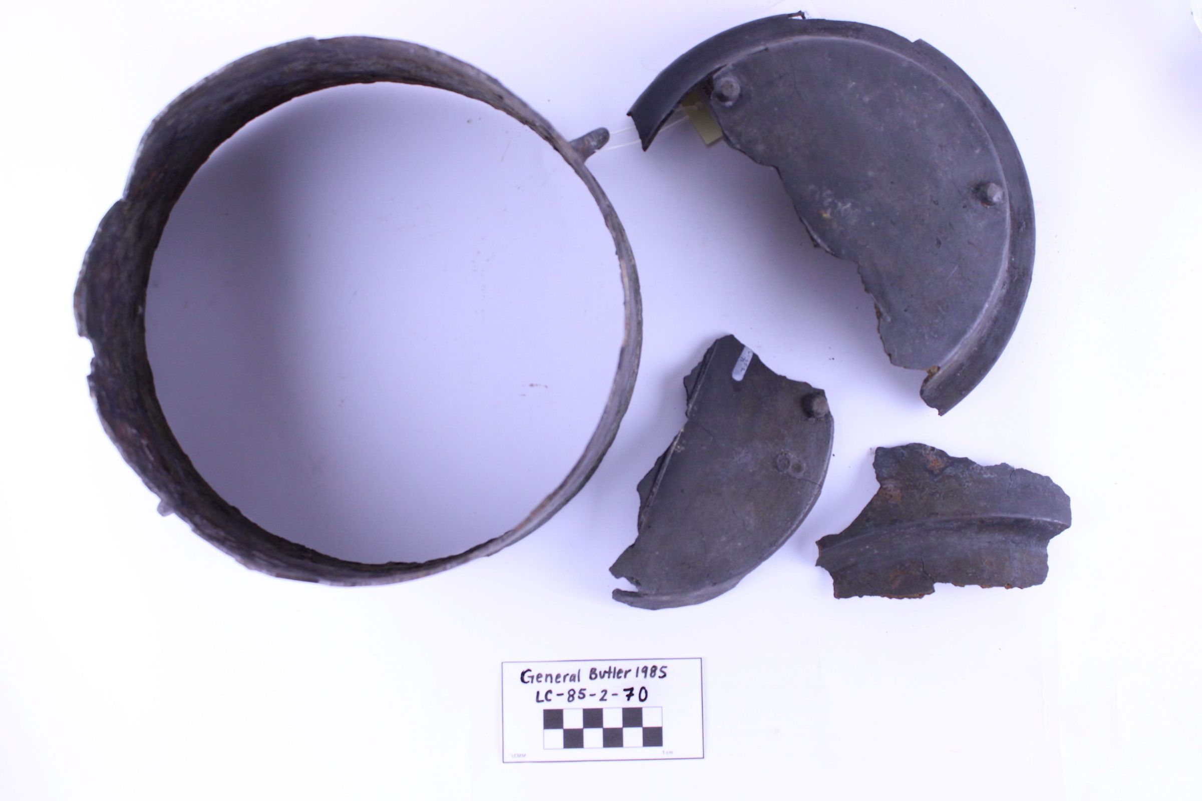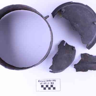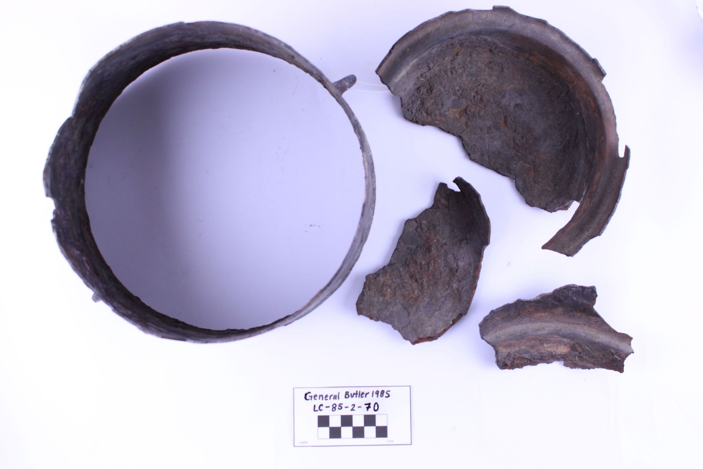 Artifact LC-85-2-70 is lot of four (4) fragments of a large cast iron pot. It has two (2) small handles on the upper rim of the pot. There are three (3) pegs on the bottom to help stabilize the object as it stands.Use
