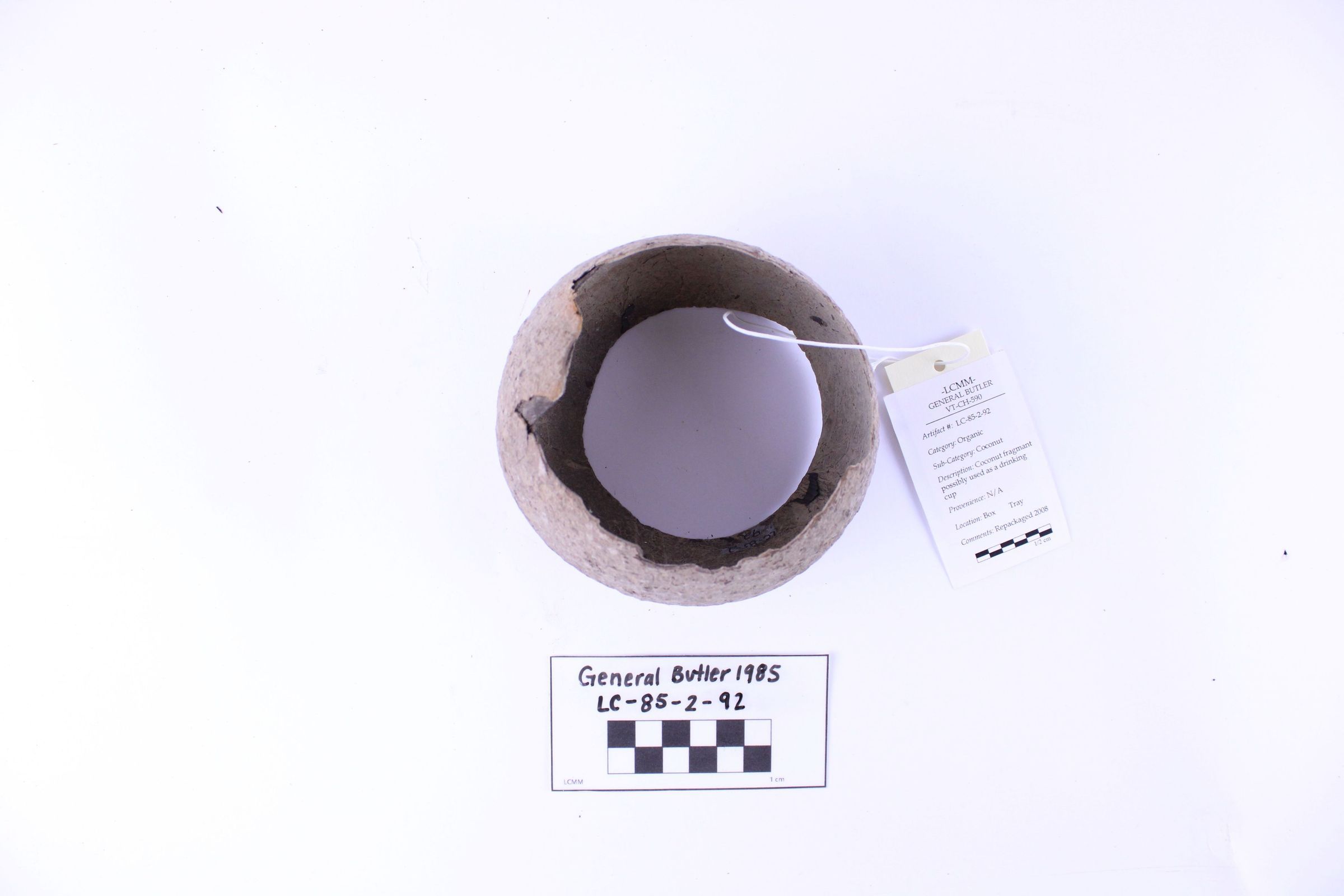 Artifact LC-85-2-92 is one (1) coconut fragment. The surface is brittle. The top has a hole carved into the surface to access the inside of the coconut. The bottom had shattered, leaving another large hole and several fragments.Use