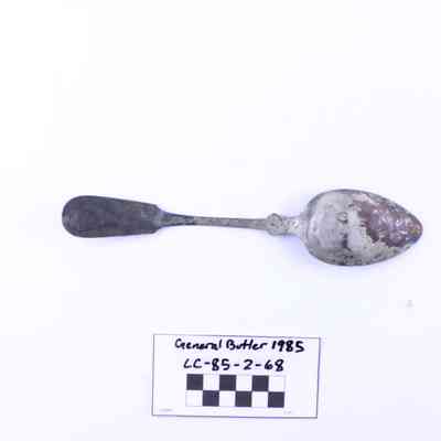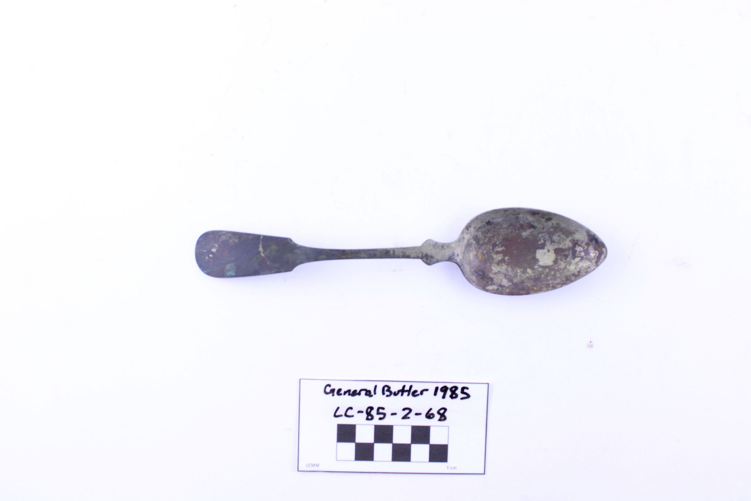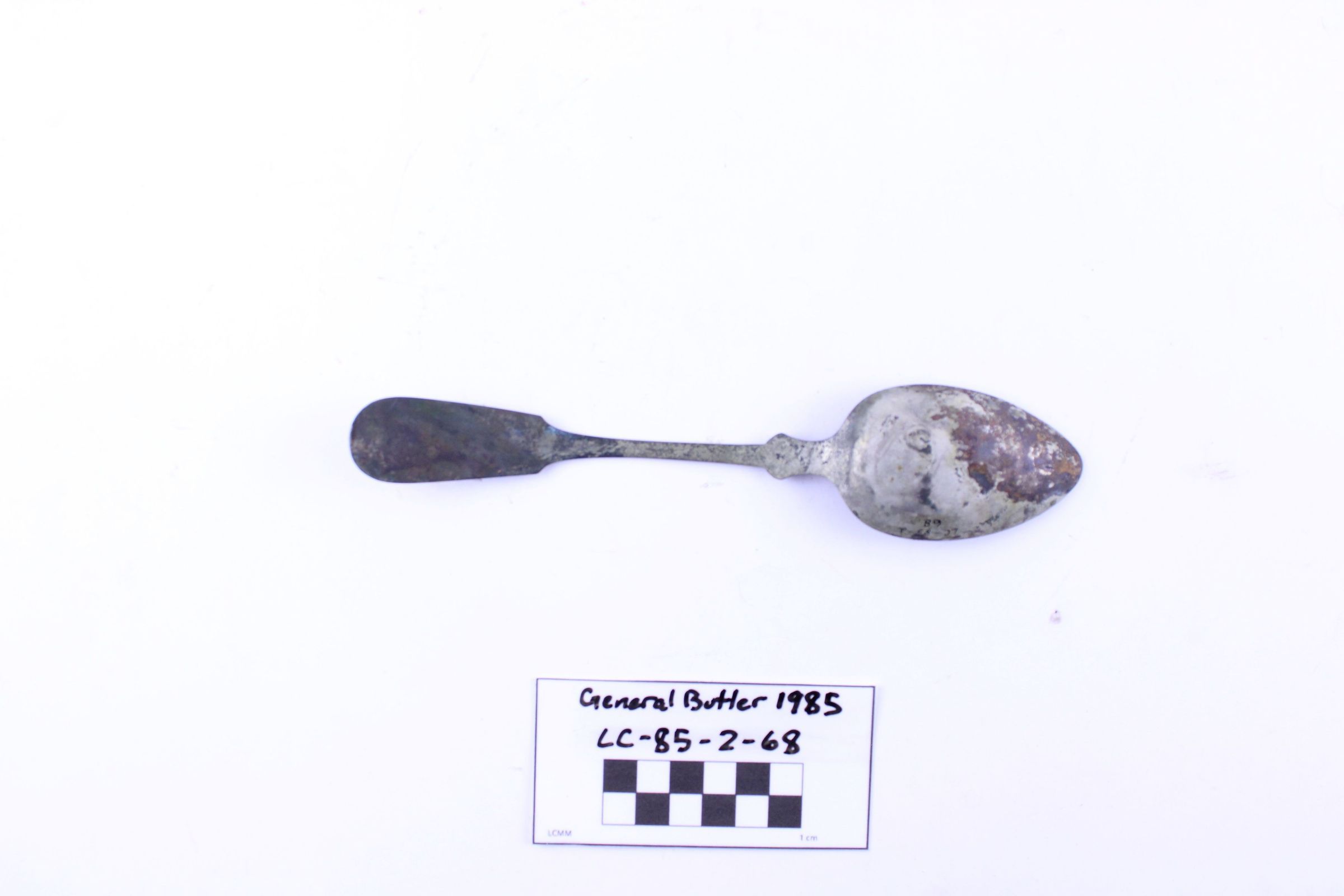 Artifact LC-85-2-68 is a copper spoon plated with nickel stamped with Hall & Eltol (?).