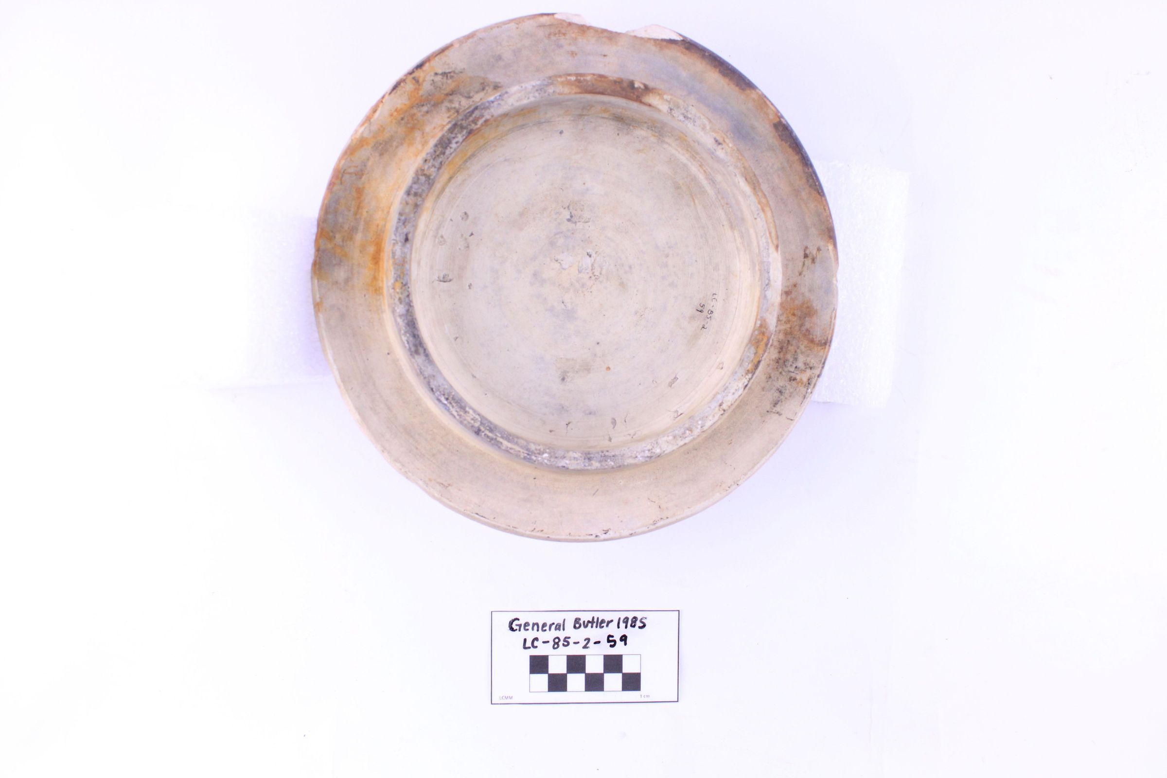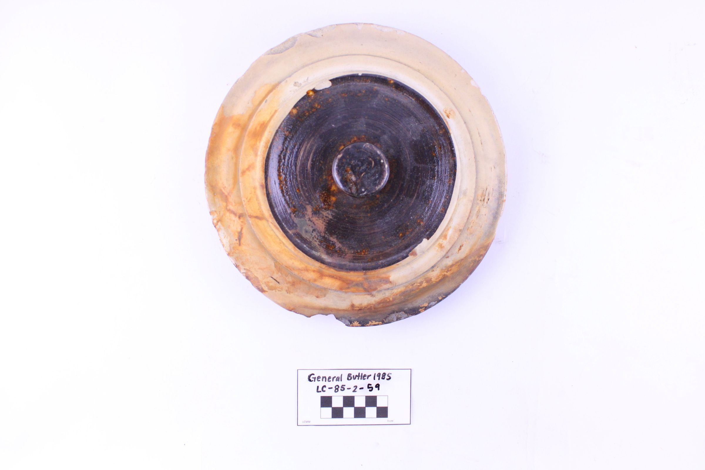 Artifact LC-85-2-59 is a large crockpot lid. There is a dark glaze surrounding the lid handle. One edge of the lid was chipped. There is orange and brown discoloration across most of the lid.