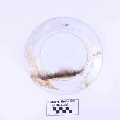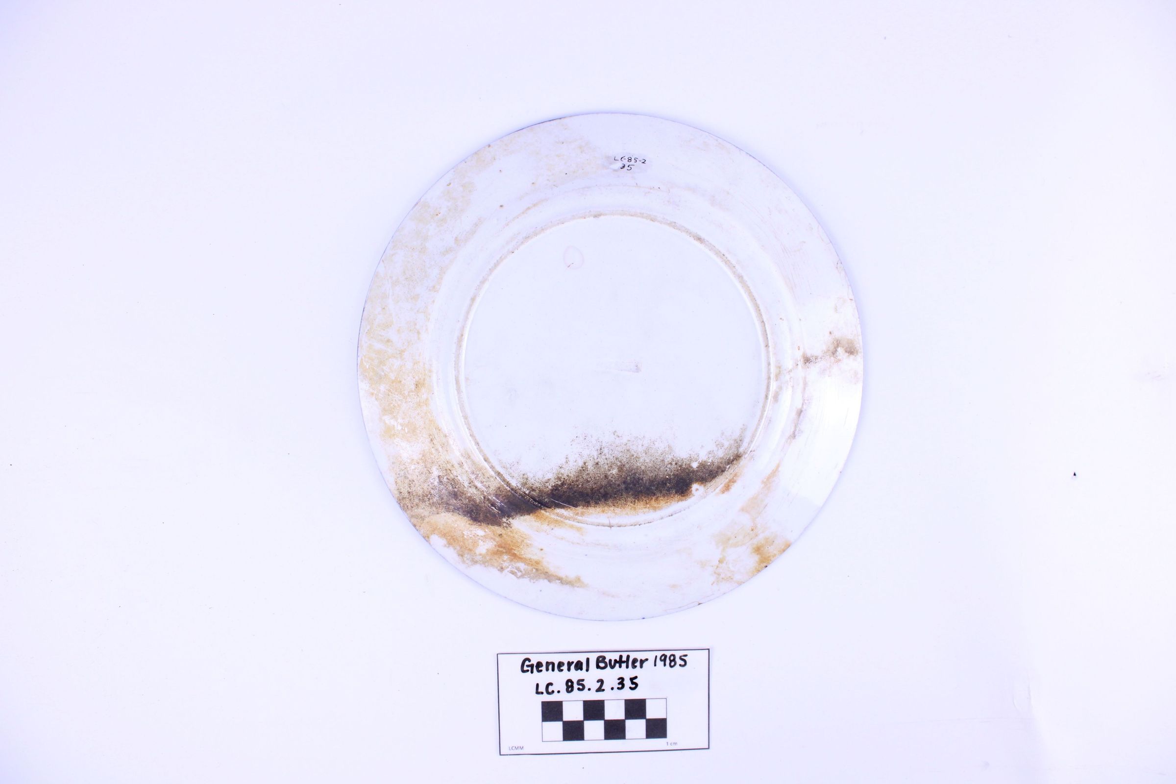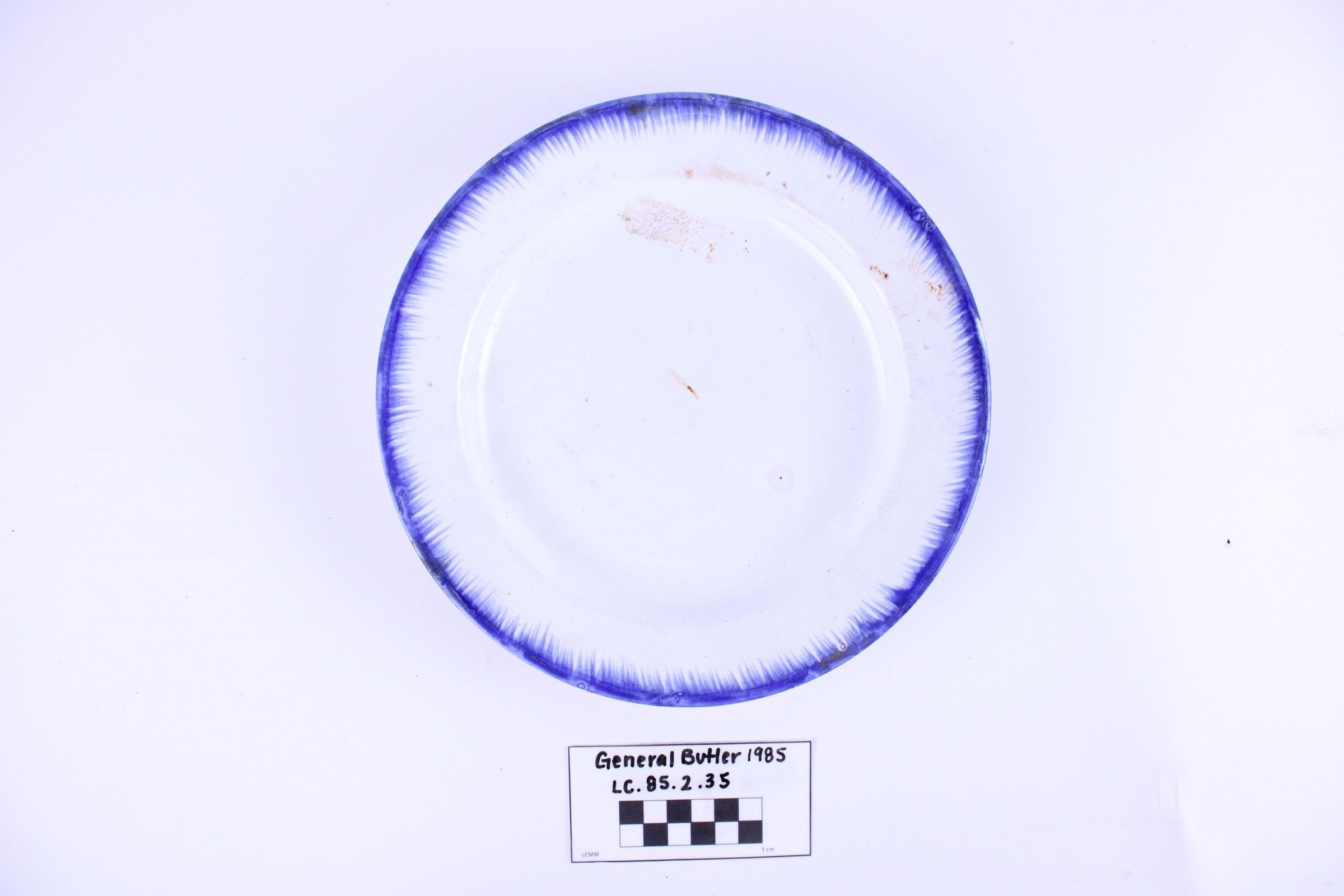 Artifact LC-85-2-35 is one (1) white ceramic plate with deep blue glaze around the rim, pulled from the General Butler. The plate has minor speckling of discoloration across the face. The bottom is a white glaze with similar brown discoloration throughout and one long dark line on the lower half . No makers mark is visible.