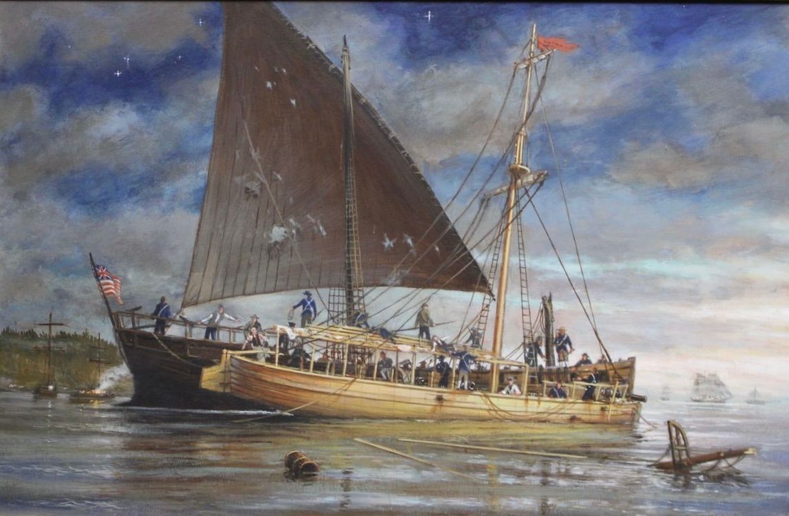 This framed painting depicts the crew of the row galley Washington heading to aid the crew of Philadelphia, which had been struck by a 24-pound cannonball to its hull and was sinking off Valcour Island during the Battle of Valcour Bay, October 11, 1776.Subject Place