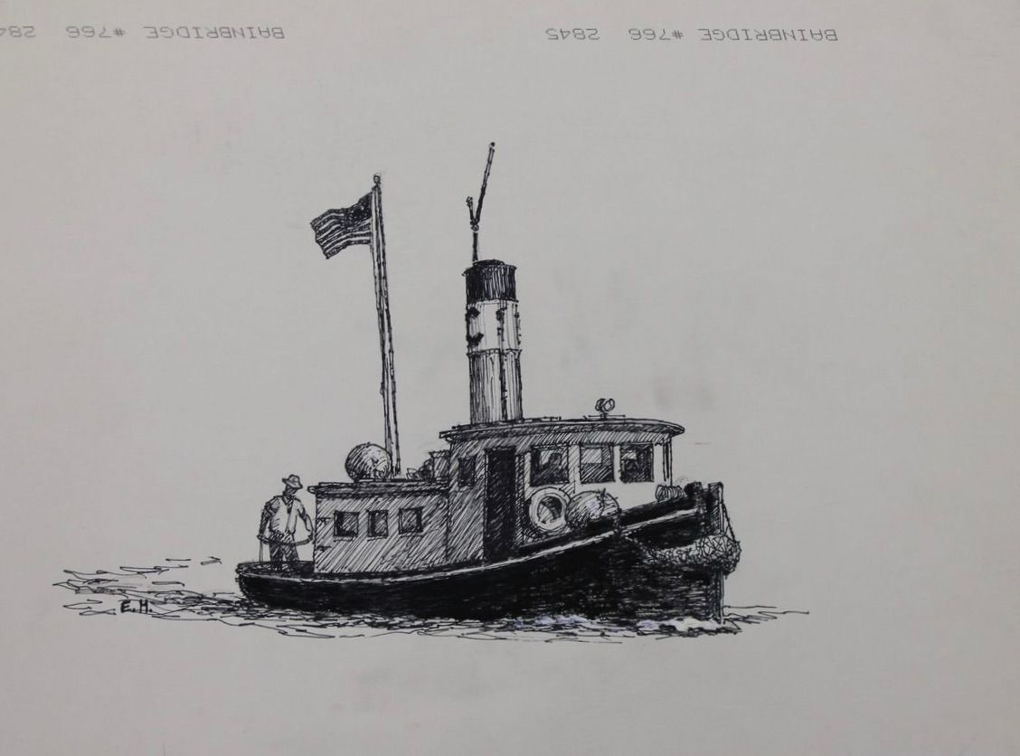 If reproduced, the credit line should read: Churchill Sketch. Ernest Haas, date unknown. Ink on paper. 12in x 16in. Lake Champlain Maritime Museum Collection.Reproductions