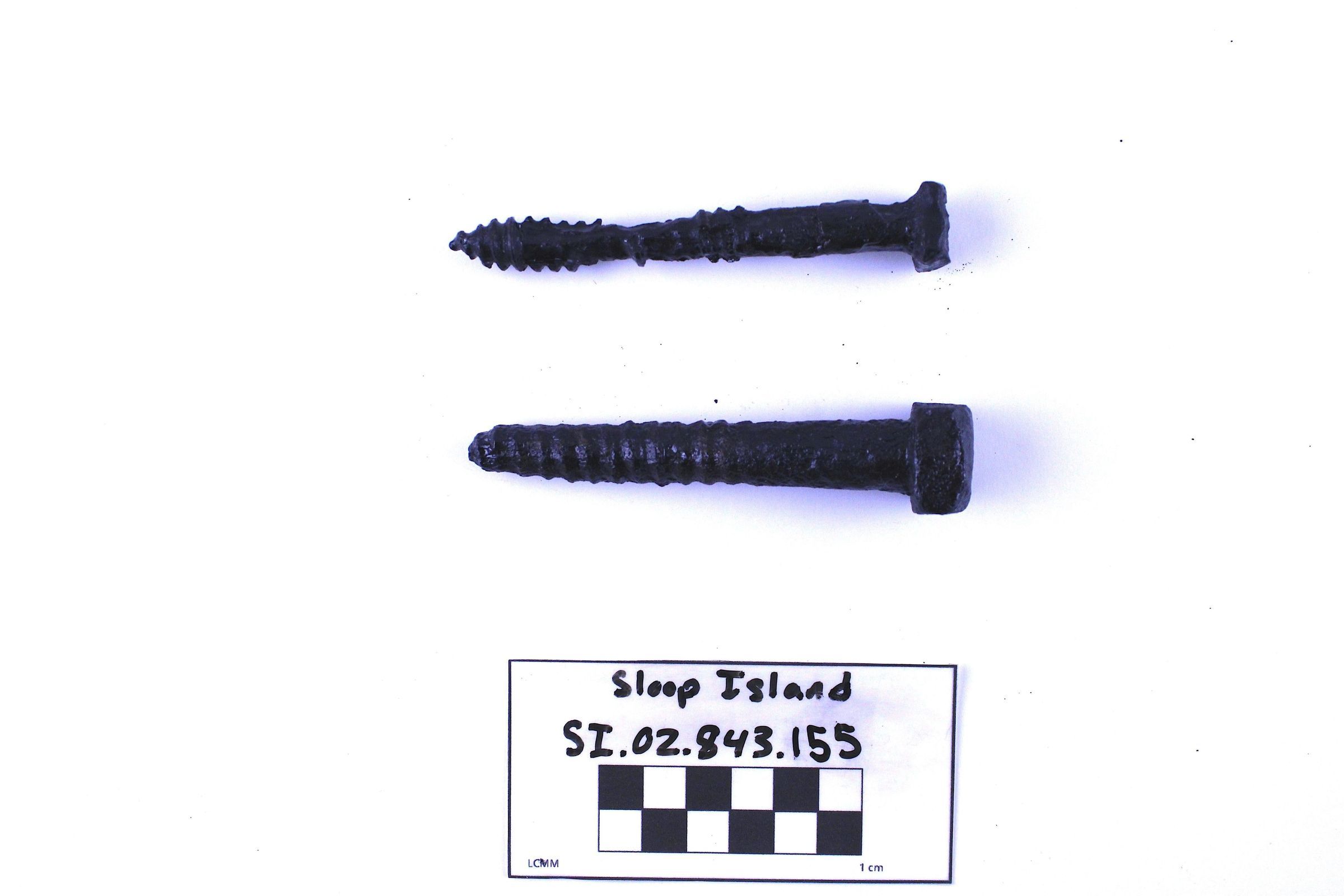 Object SI.02.843.155 is a lot of two (2) bolts. One (1) is larger than the other. The smaller of the two (2) is missing some of its screw ridges.