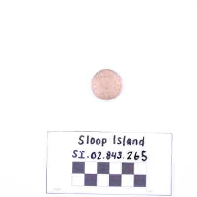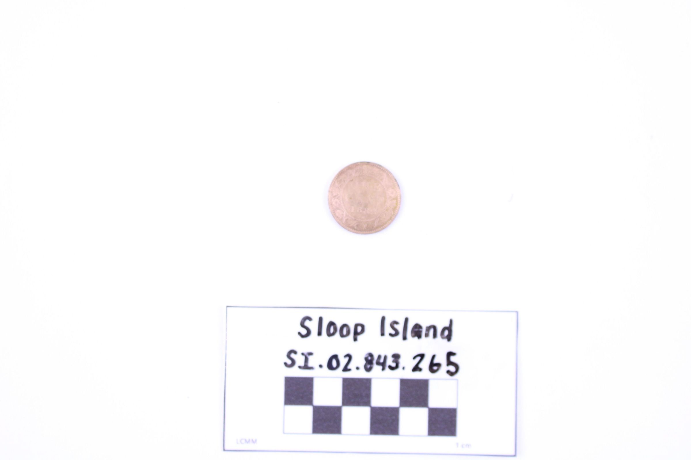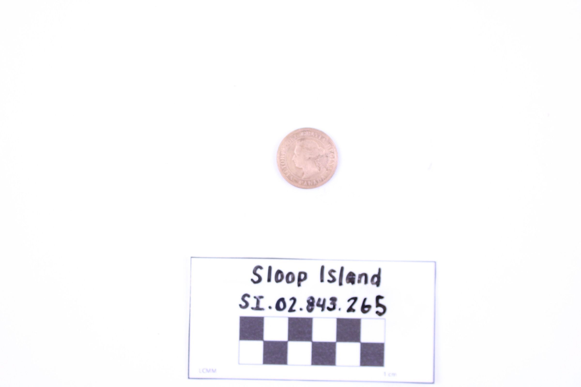 Object SI.02.843.265 is a Canadian penny stamped with a cameo of Queen Victoria and the words "VICTORIA DEI GRATIA REGINA CANADA". The back is stamped with a wreath of ivy and the words "One Cent 1882".Use