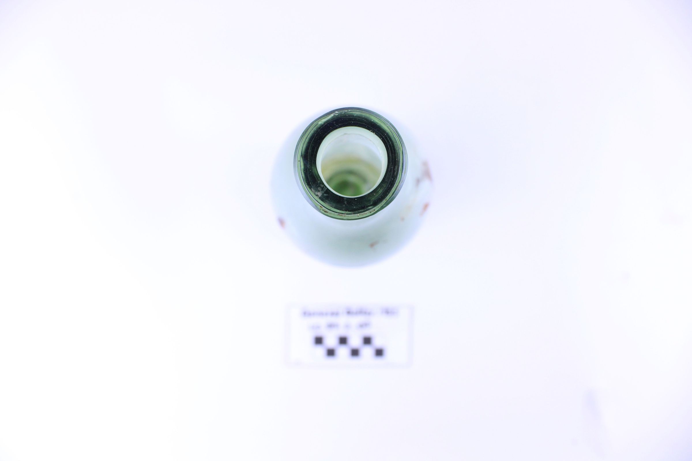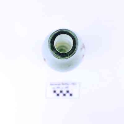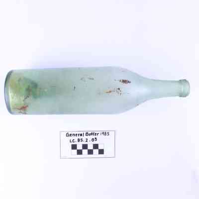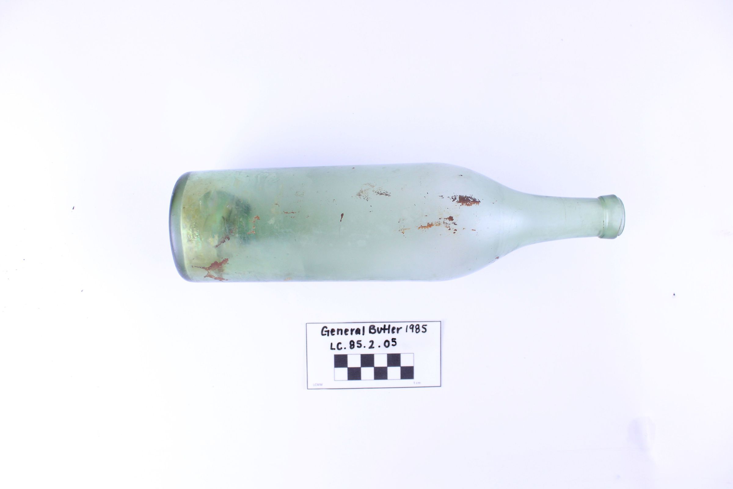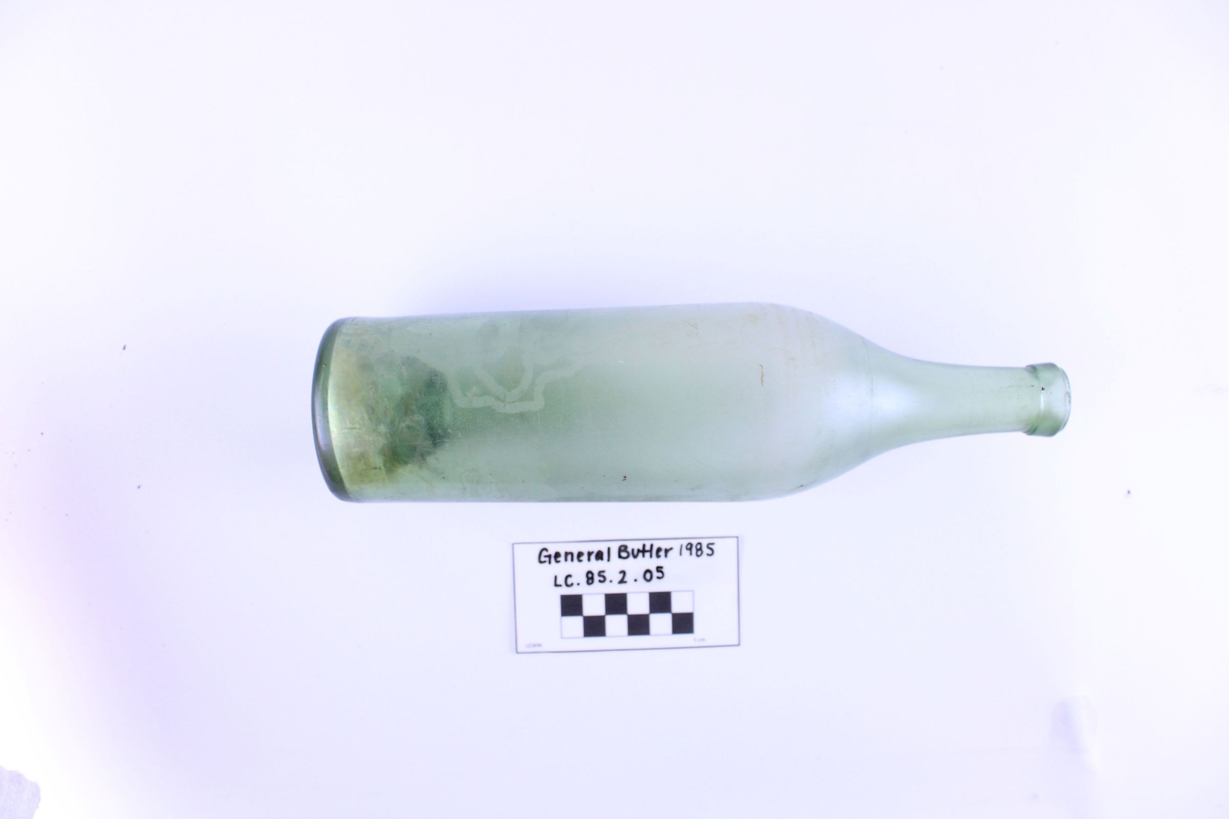 Artifact LC-85-2-05 is one (1) light green glass bottle with a narrow circular base and long neck. It has clouded marks around the bottom and red discoloration across one side.