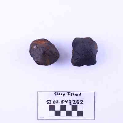 Object SI.02.843.252 is a lot of two (2) charcoal briquettes. Their color has taken on an orange tone along the edges.