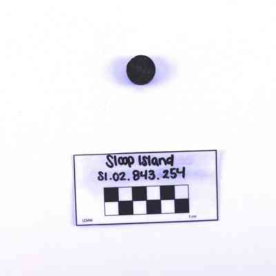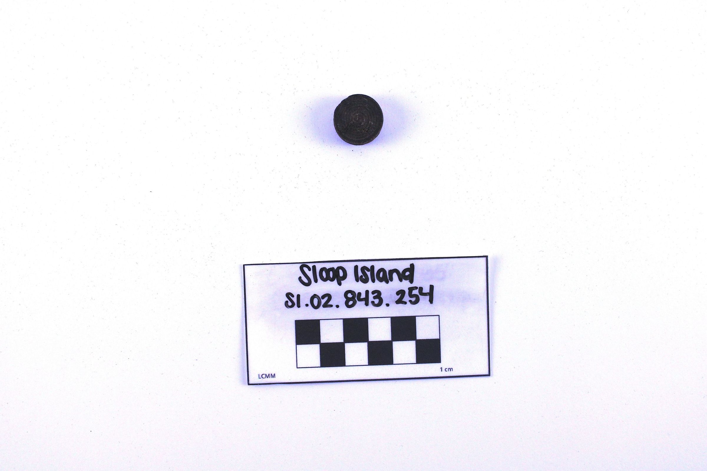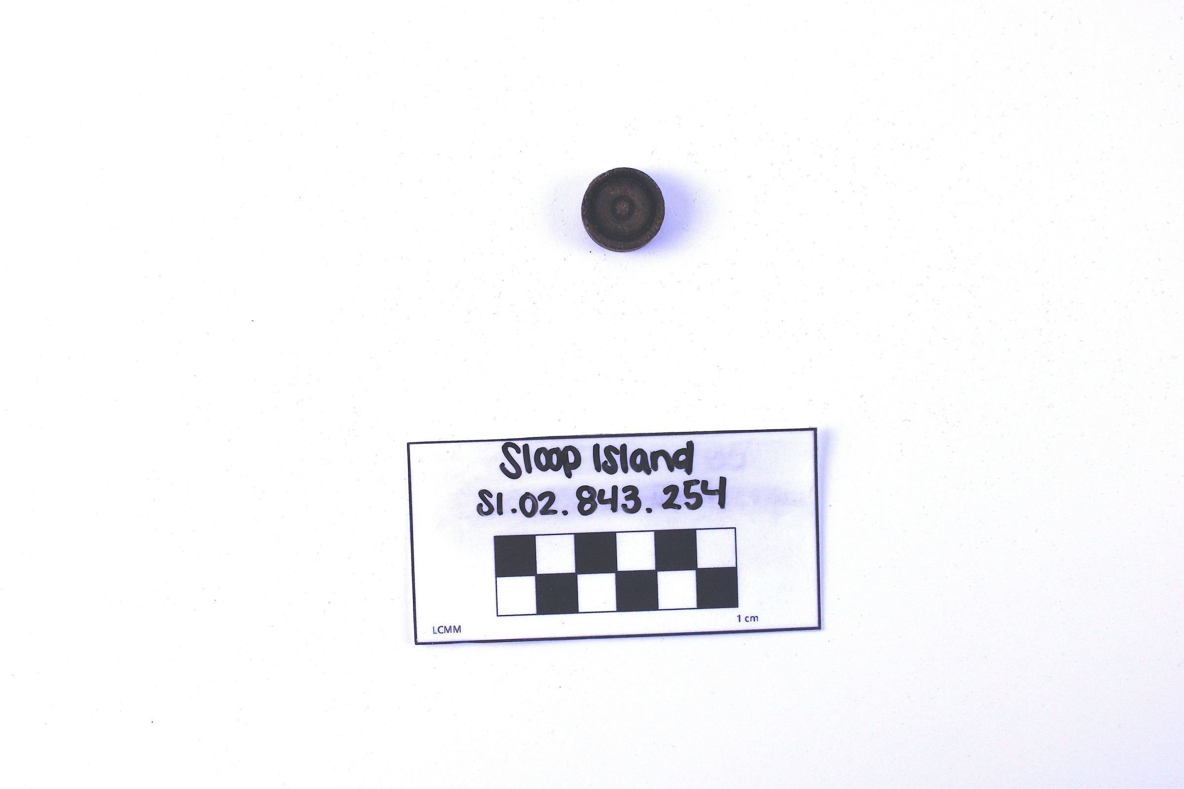 Object SI.02.843.254 is a wooden checker piece. It has two circles carved into one side.