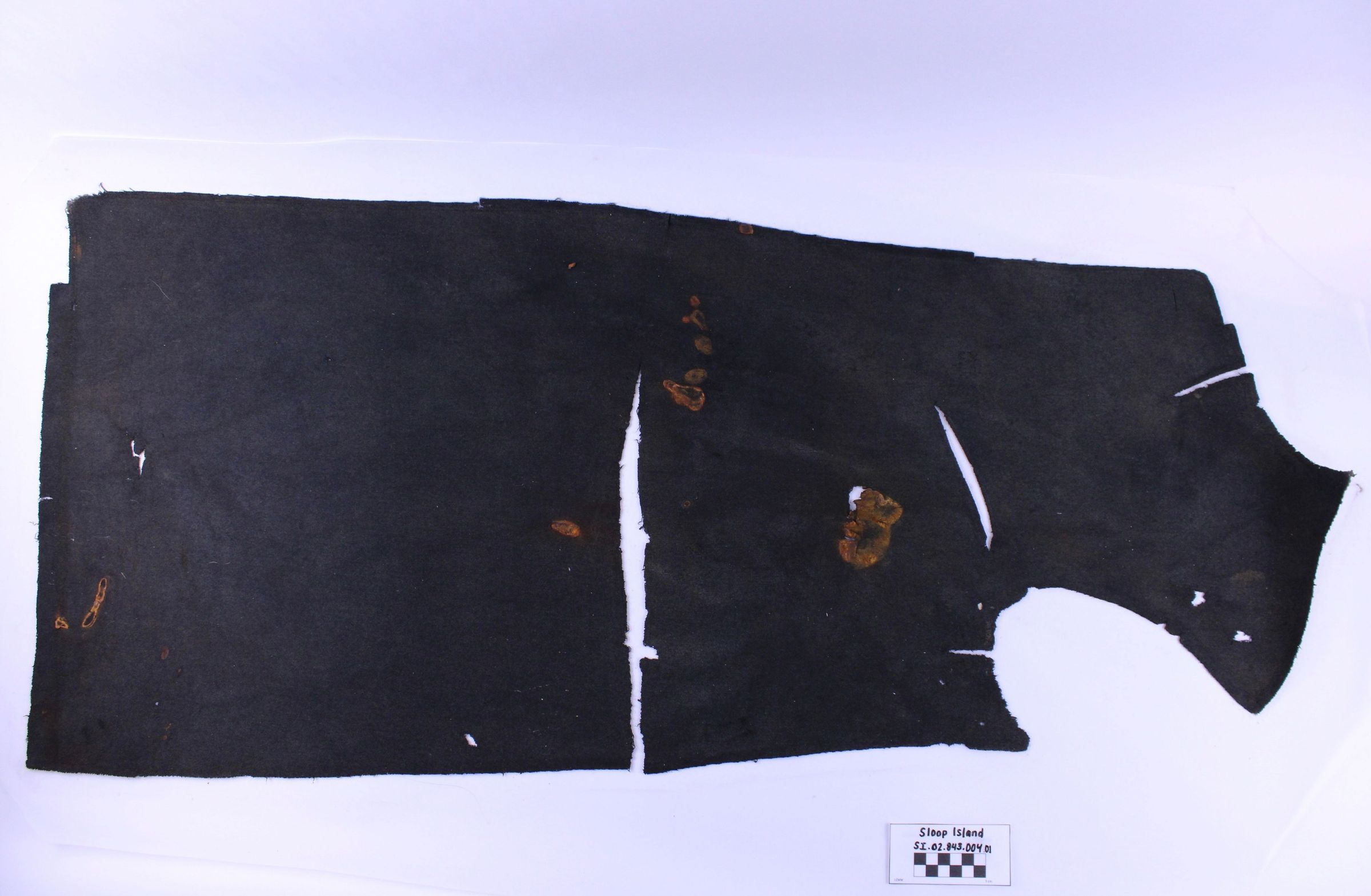 Object SI.02843.004.001 is the front left panel of a wool coat.The wool is black, though rust from nearby iron artifacts has discolored some areas of the fabric.Use